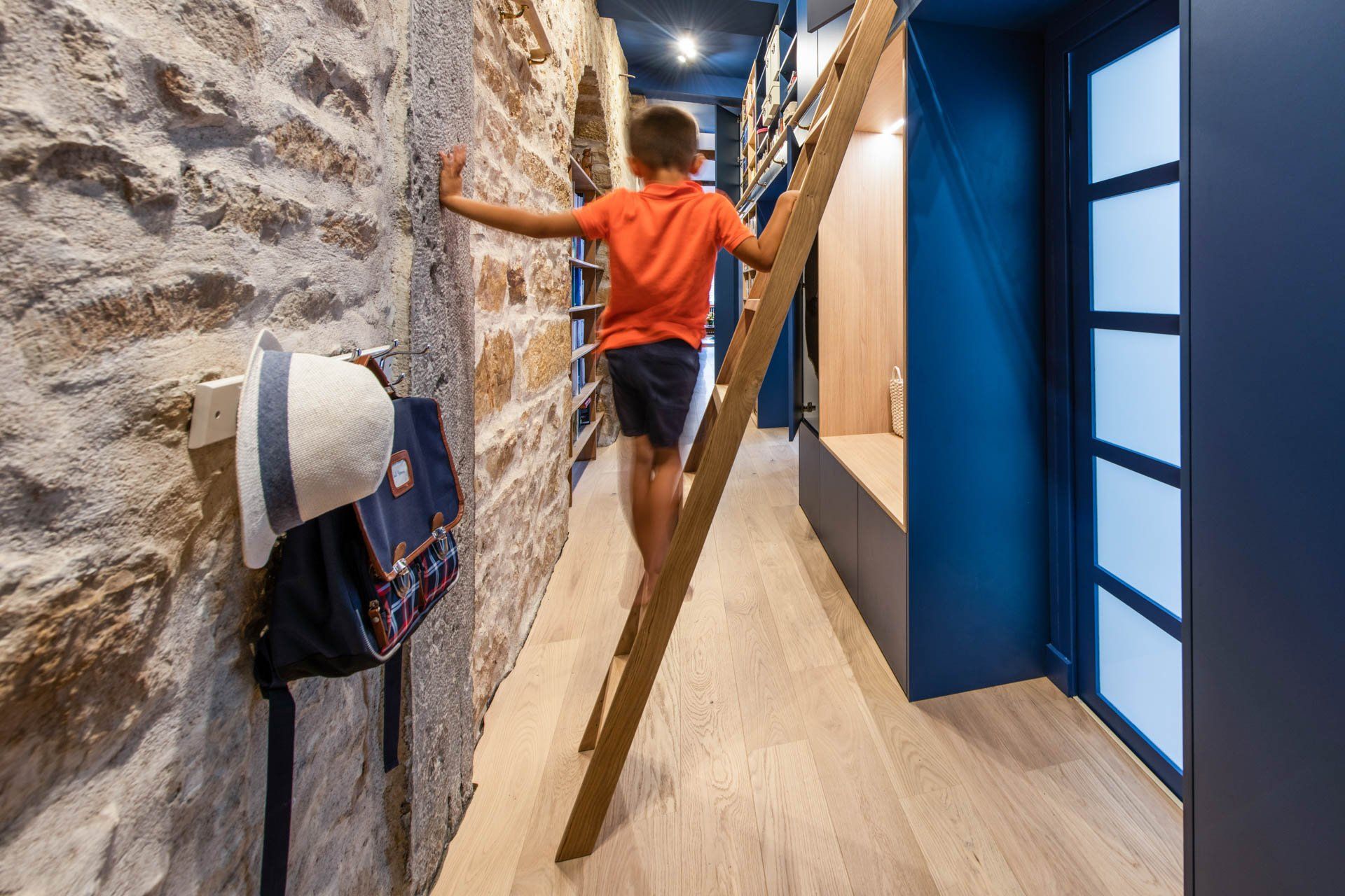 Grand Bleu, où Margot a su préserver la beauté du couloir (un mur en pierre jointée) tout en rendant l’espace agréable et ultra fonctionnel.
