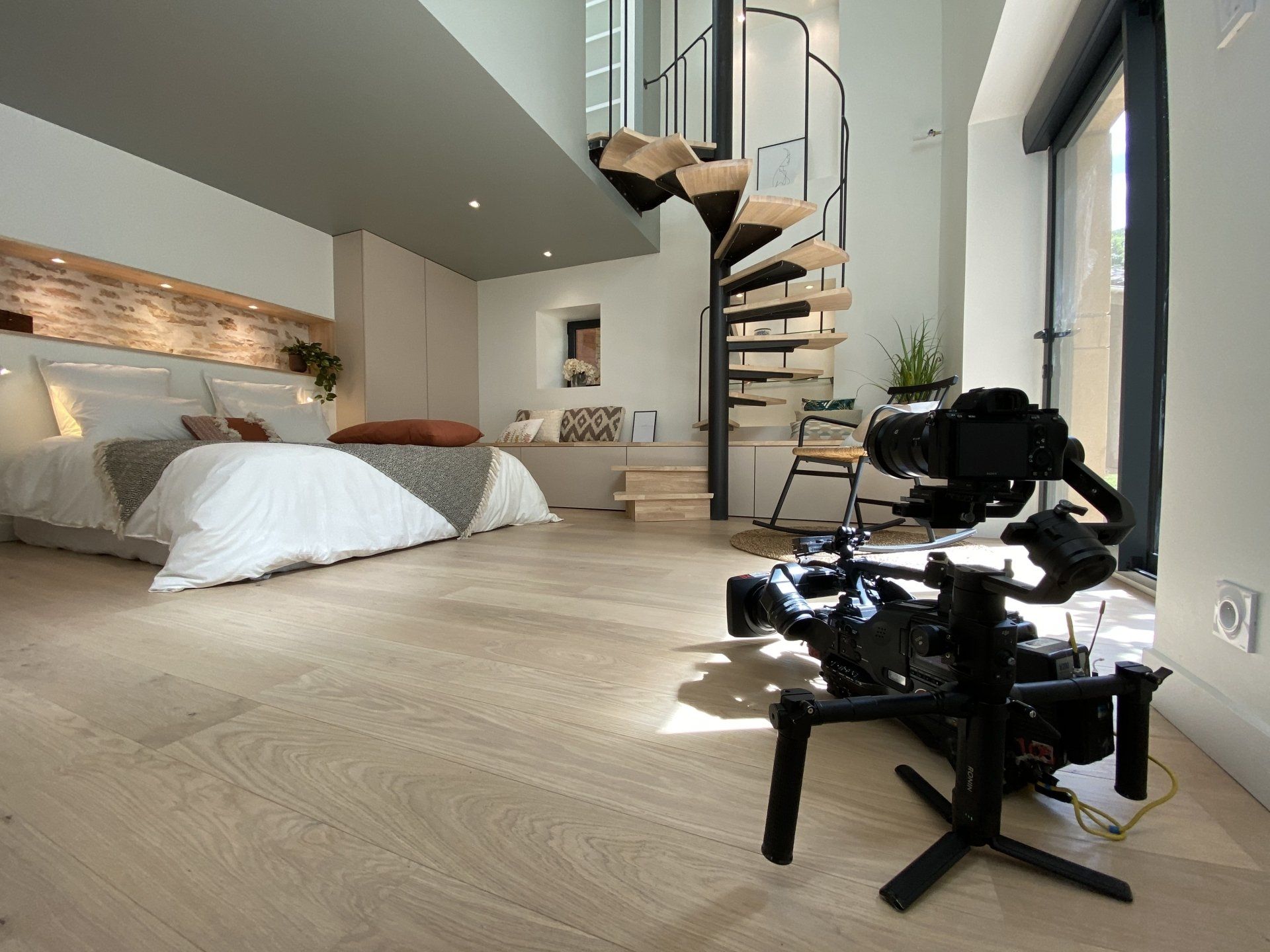 Une partie de ce dernier est utilisée pour faire office de marche dans un escalier hélicoïdal clair en bois, sans contremarche, avec un garde-corps léger et aérien en métal. Le lit est placé entre deux placards clairs peu profonds prévus pour accueillir le linge de nuit. Une tête de lit dans les mêmes tons est créée. Cette dernière apporte une touche de caractère et d’authenticité en conservant quelques pierres d’origine apparentes. Des LED incrustées dans la partie haute de cette alcôve éclairent les pierres avec douceur.