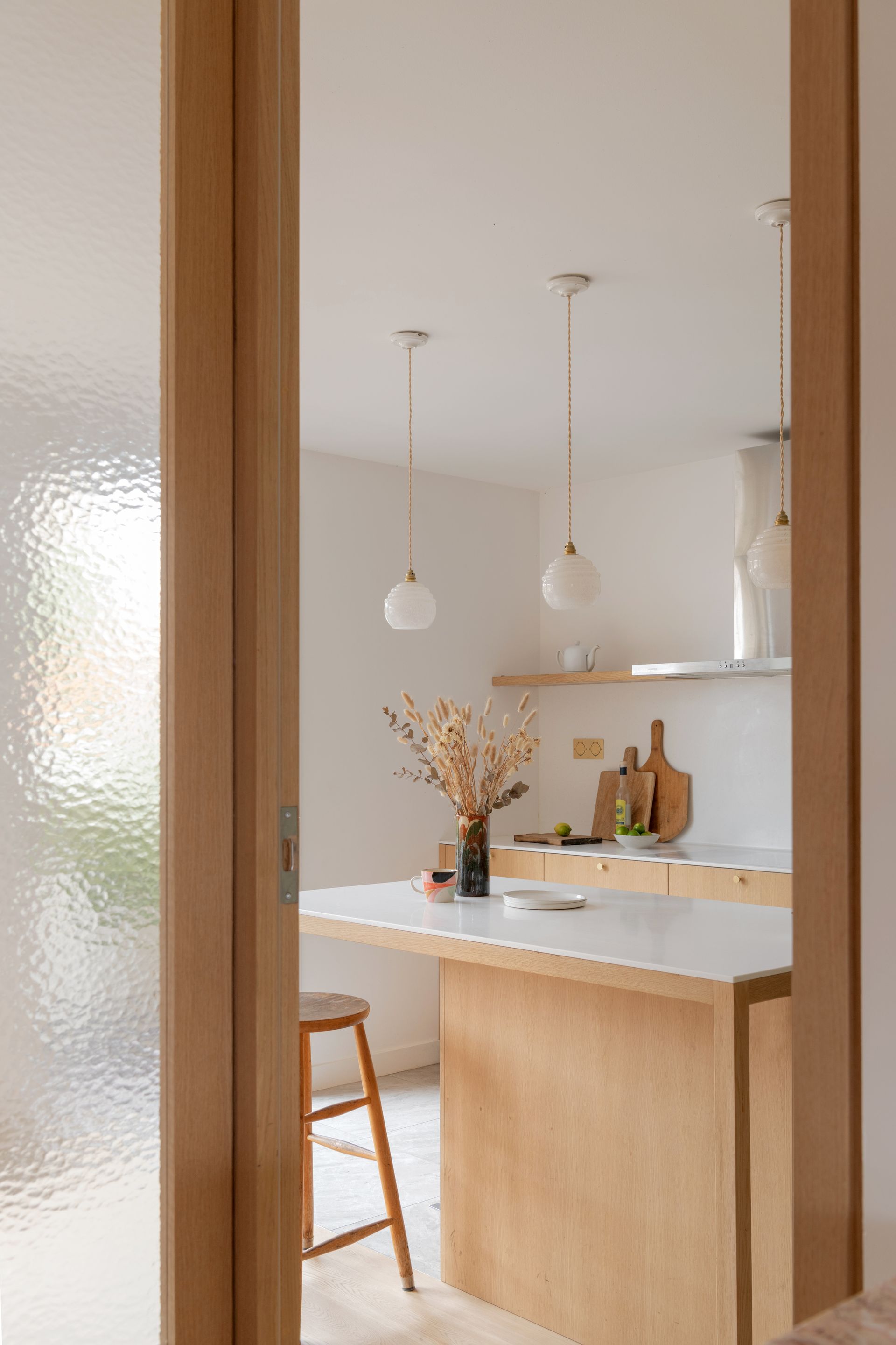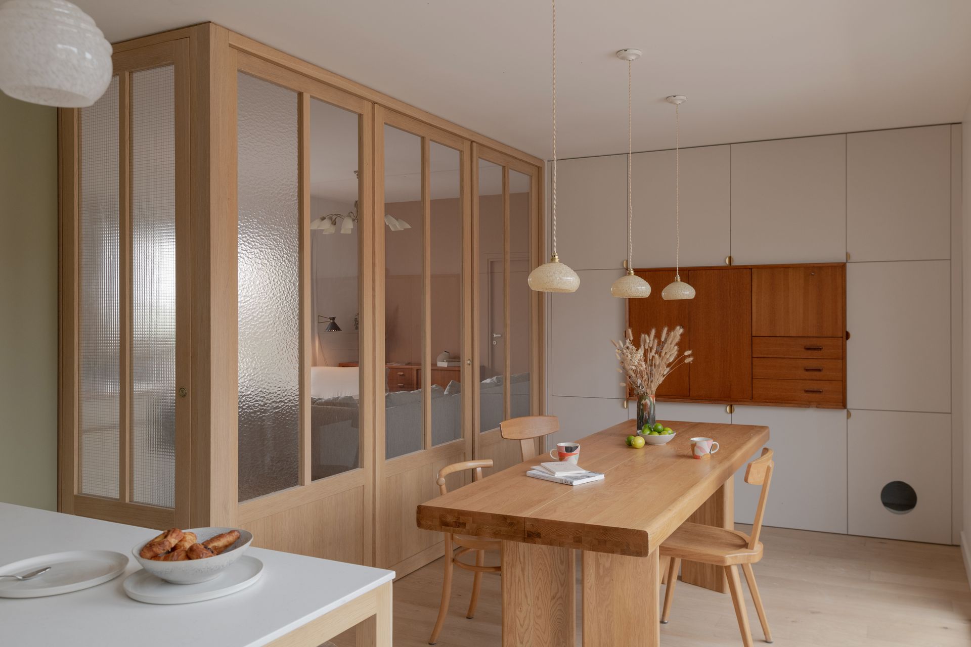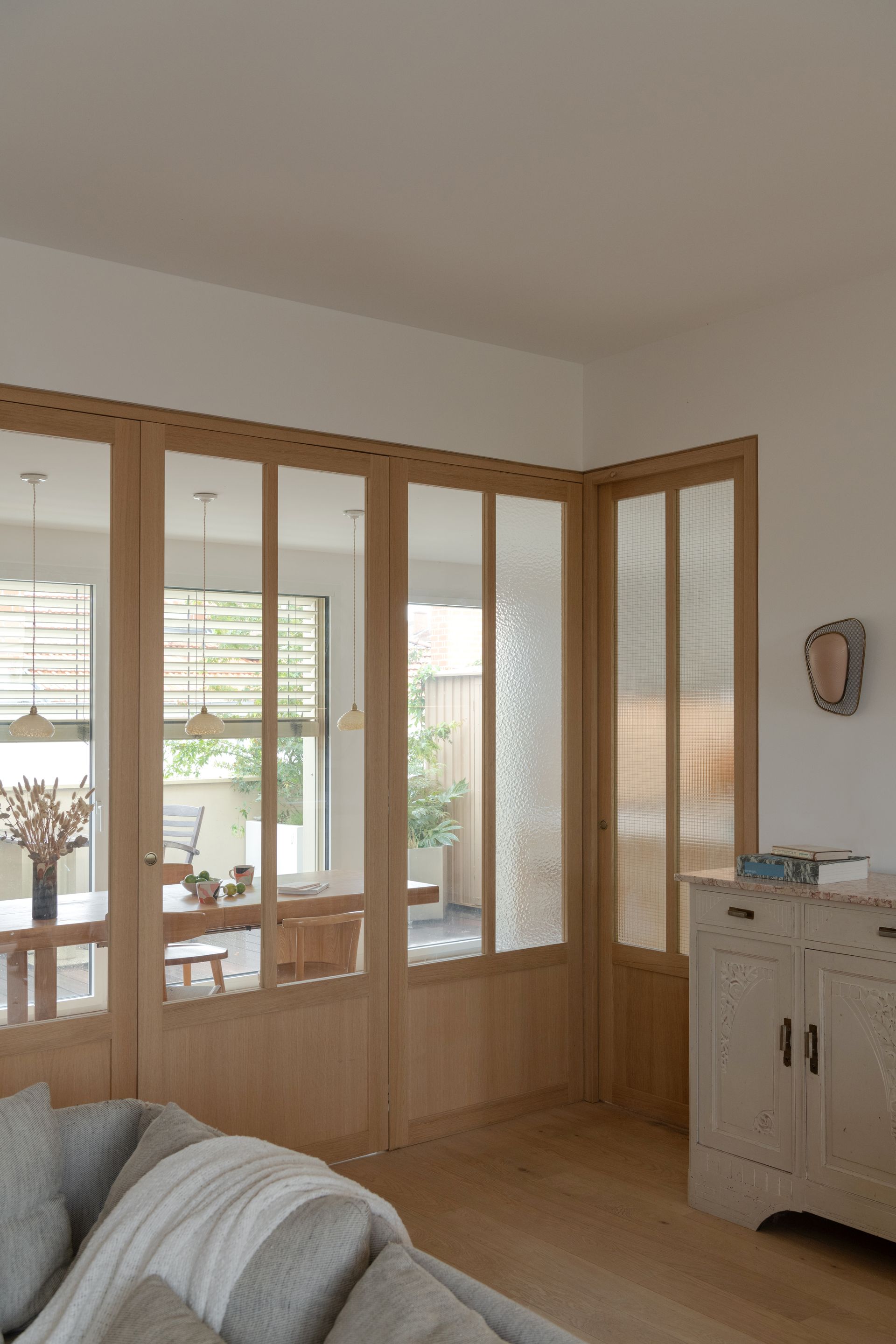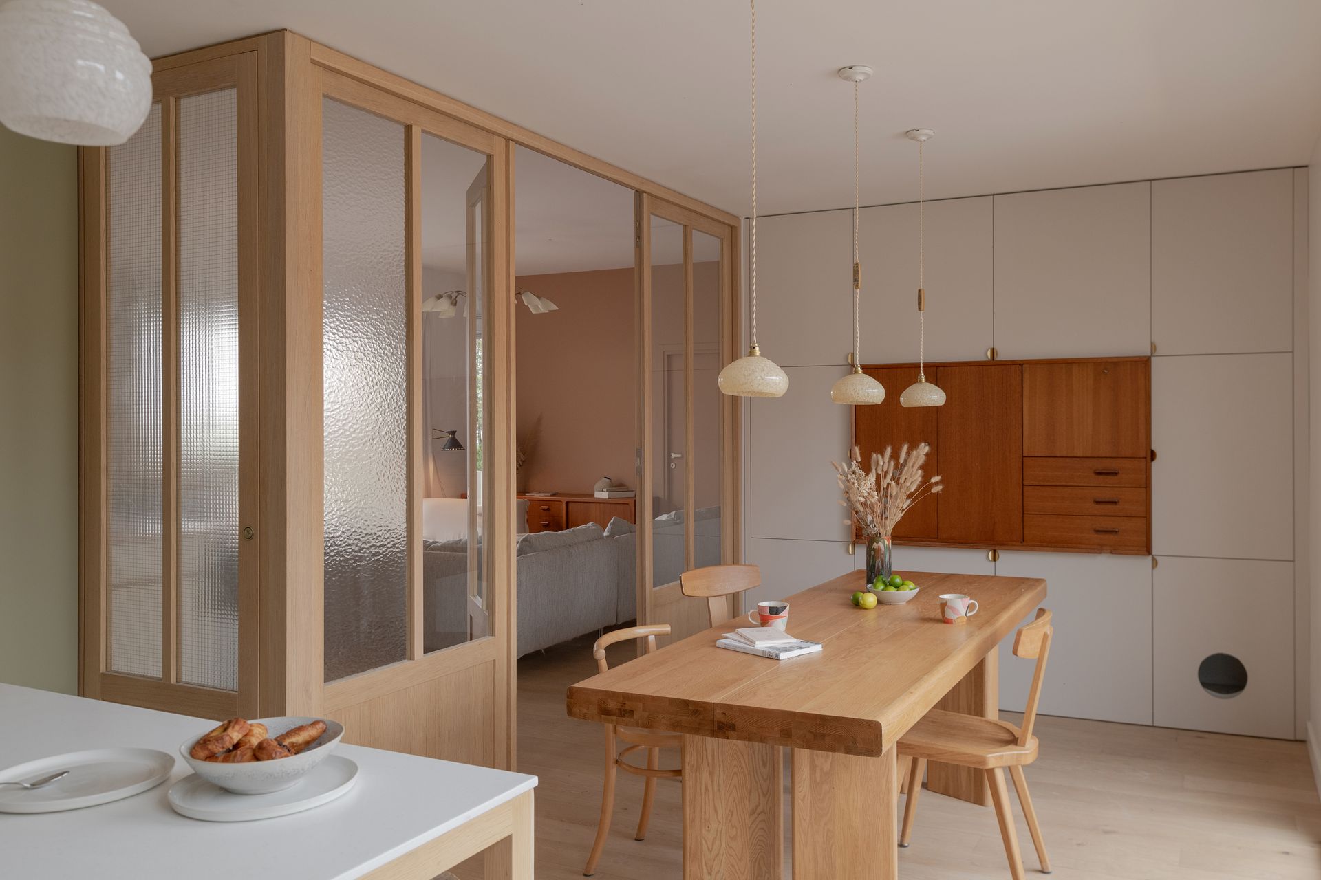 - Verrière en bois et verre flouté : création d’une séparation transparente entre le salon et la cuisine, laissant circuler la lumière tout en préservant l’intimité des espaces.