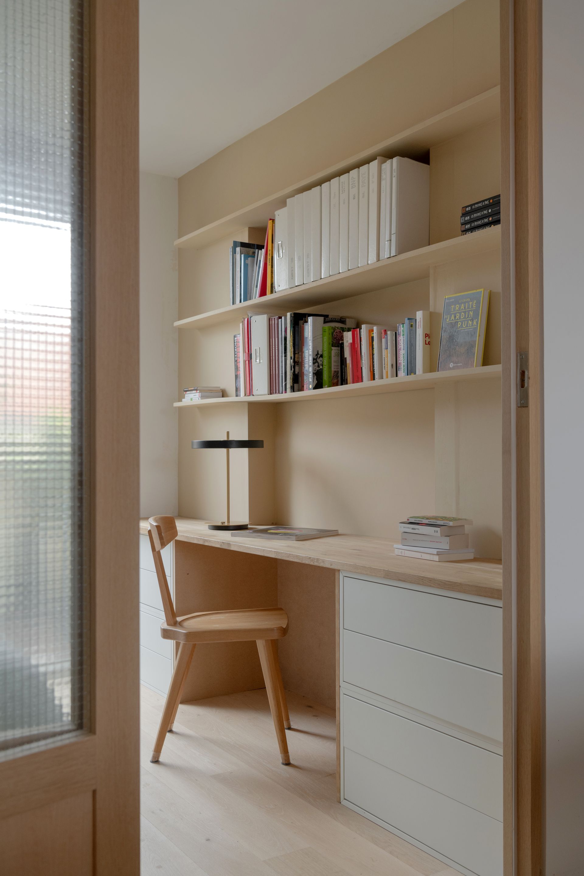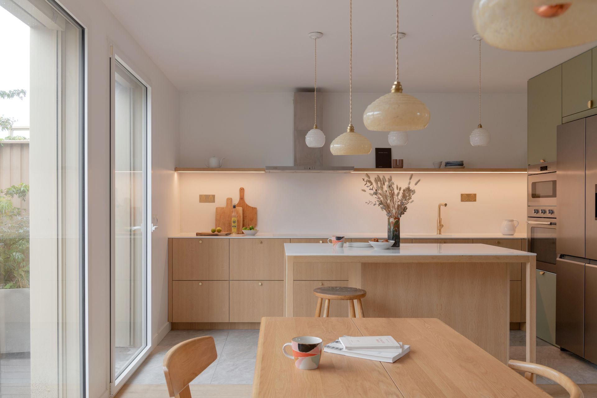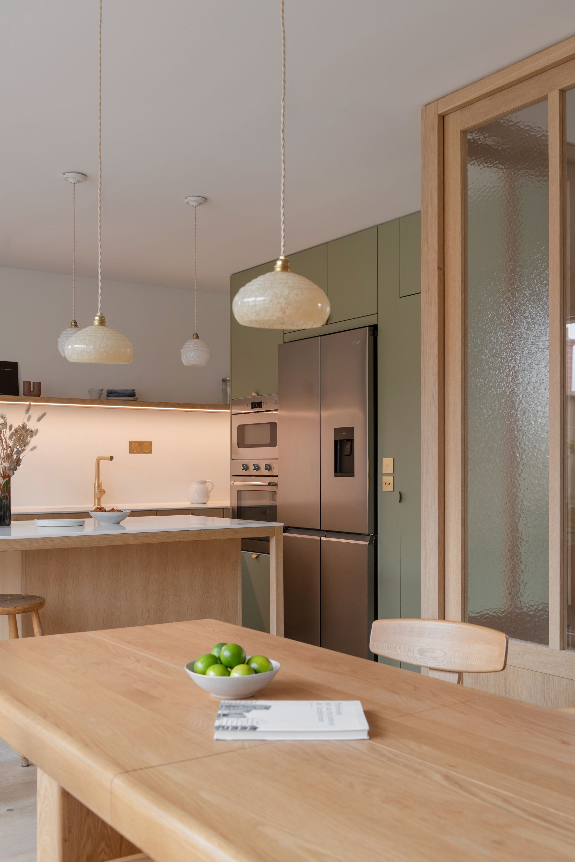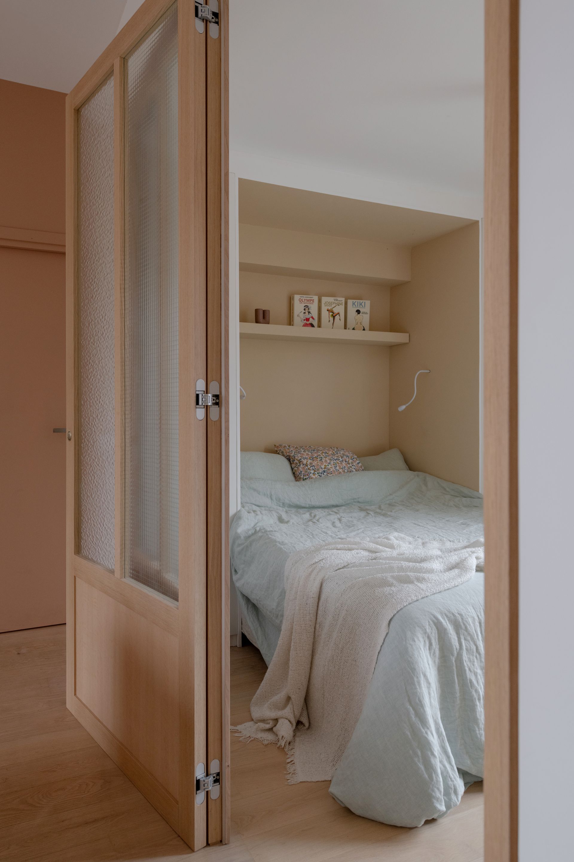 - Verrière en bois et verre flouté : création d’une séparation transparente entre le salon et la cuisine, laissant circuler la lumière tout en préservant l’intimité des espaces.