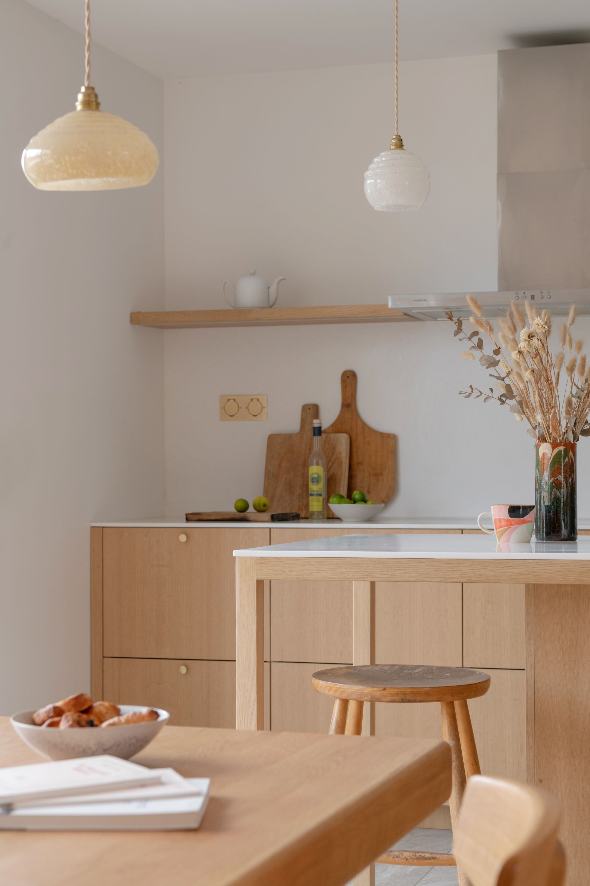 - Cuisine sur mesure : réemploi d’une ancienne commode en bois massif, intégrée dans un meuble moderne aux tons neutres, qui fait ressortir la chaleur et la richesse naturelle du bois.