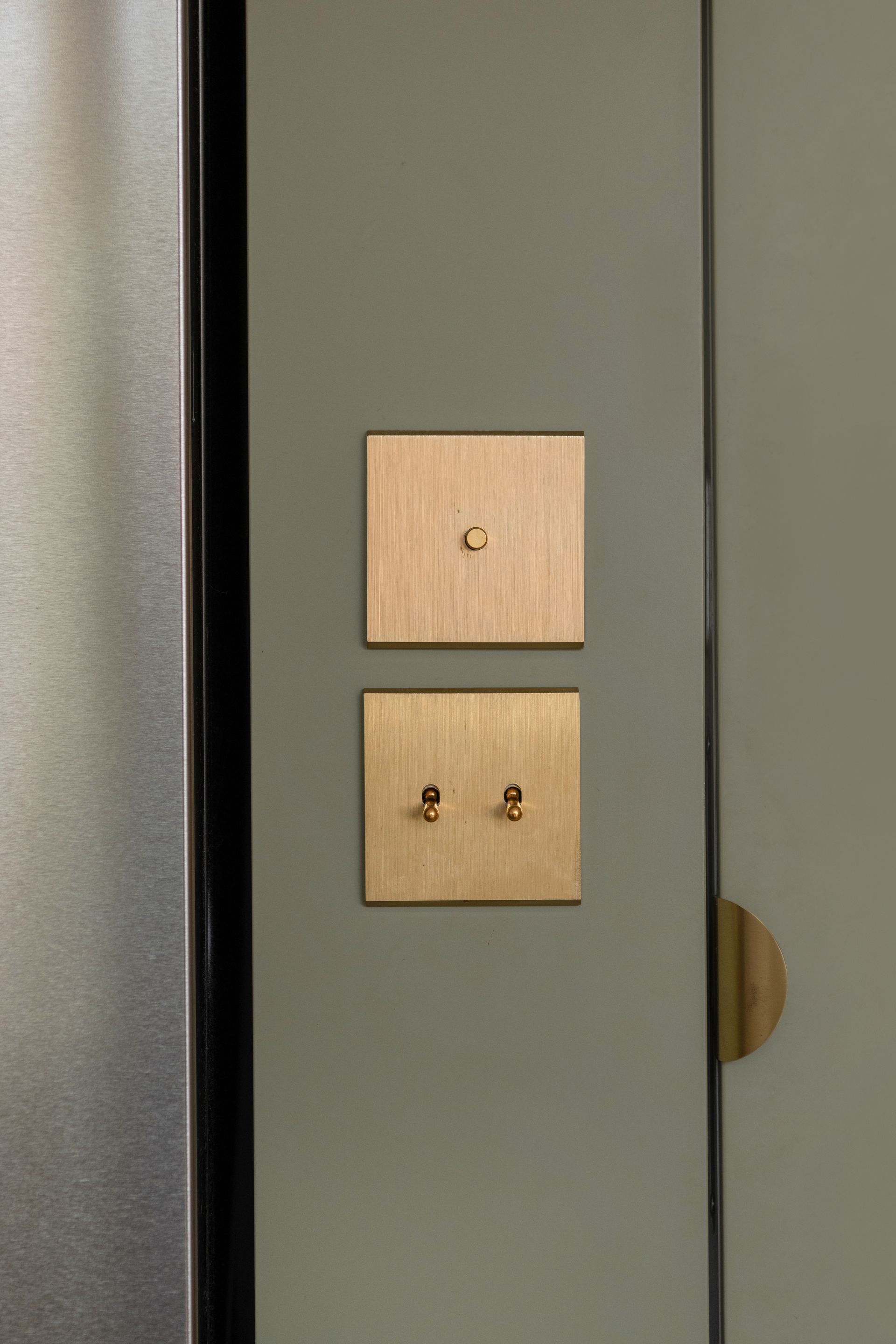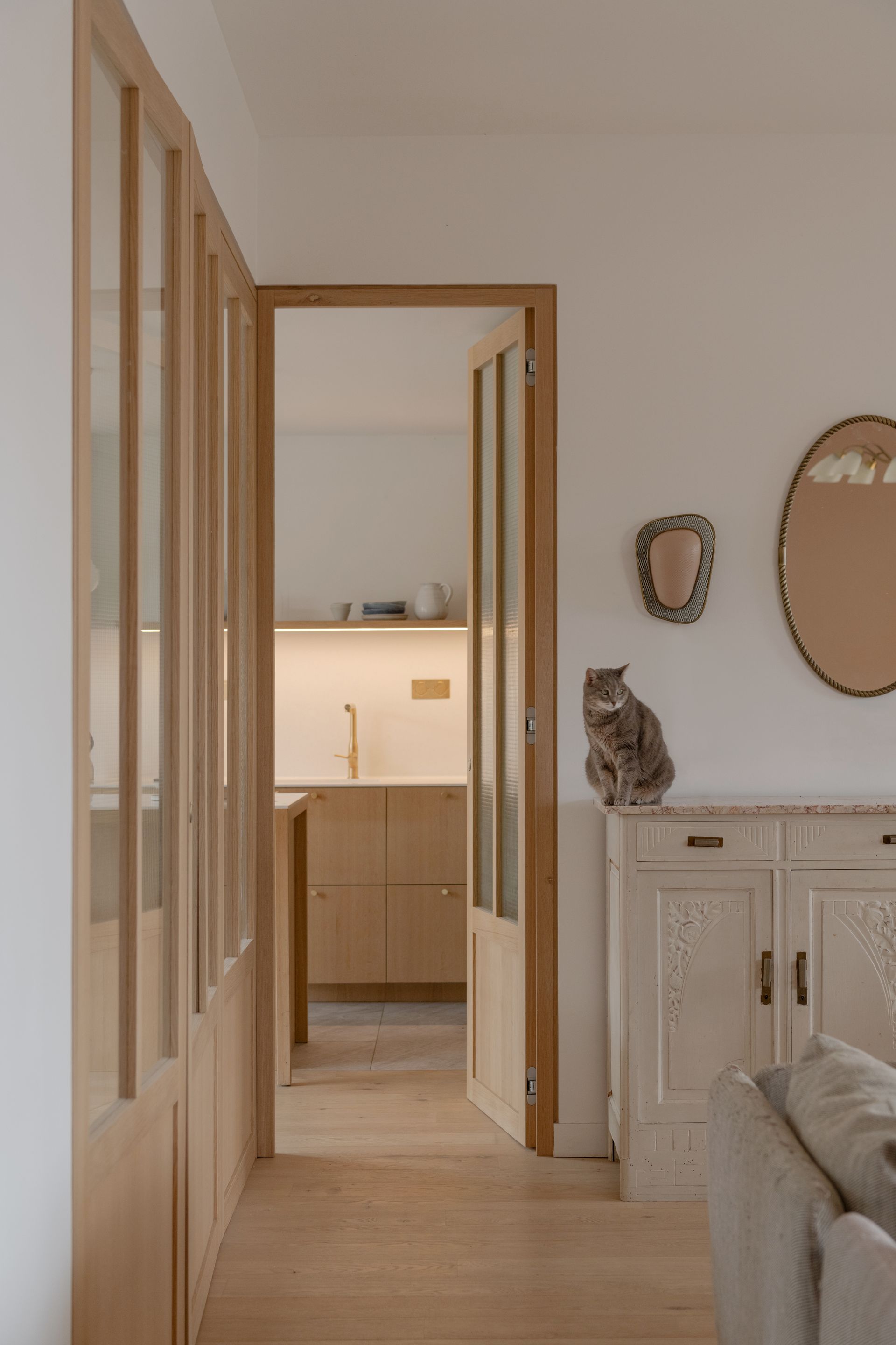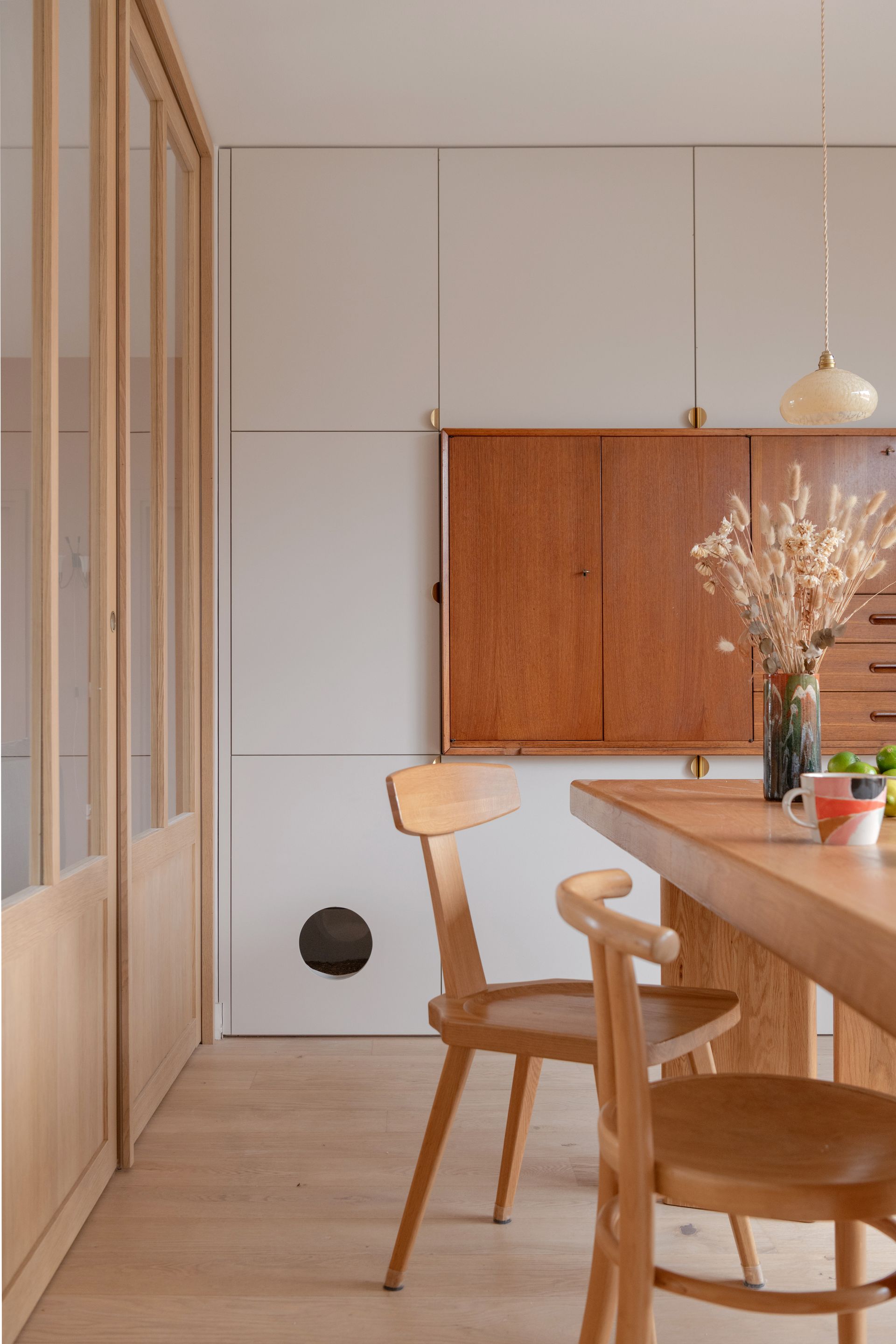 Chat Perché joue sur un équilibre entre élégance et sobriété. Dans la cuisine, nous avons imaginé un meuble sur mesure au centre, réutilisant l’une de leurs anciennes commodes, entouré de portes modernes. Dans le bas de ces portes, des accès discrets aux litières des chats ont été intégrés, faisant de ce projet un aménagement pensé pour