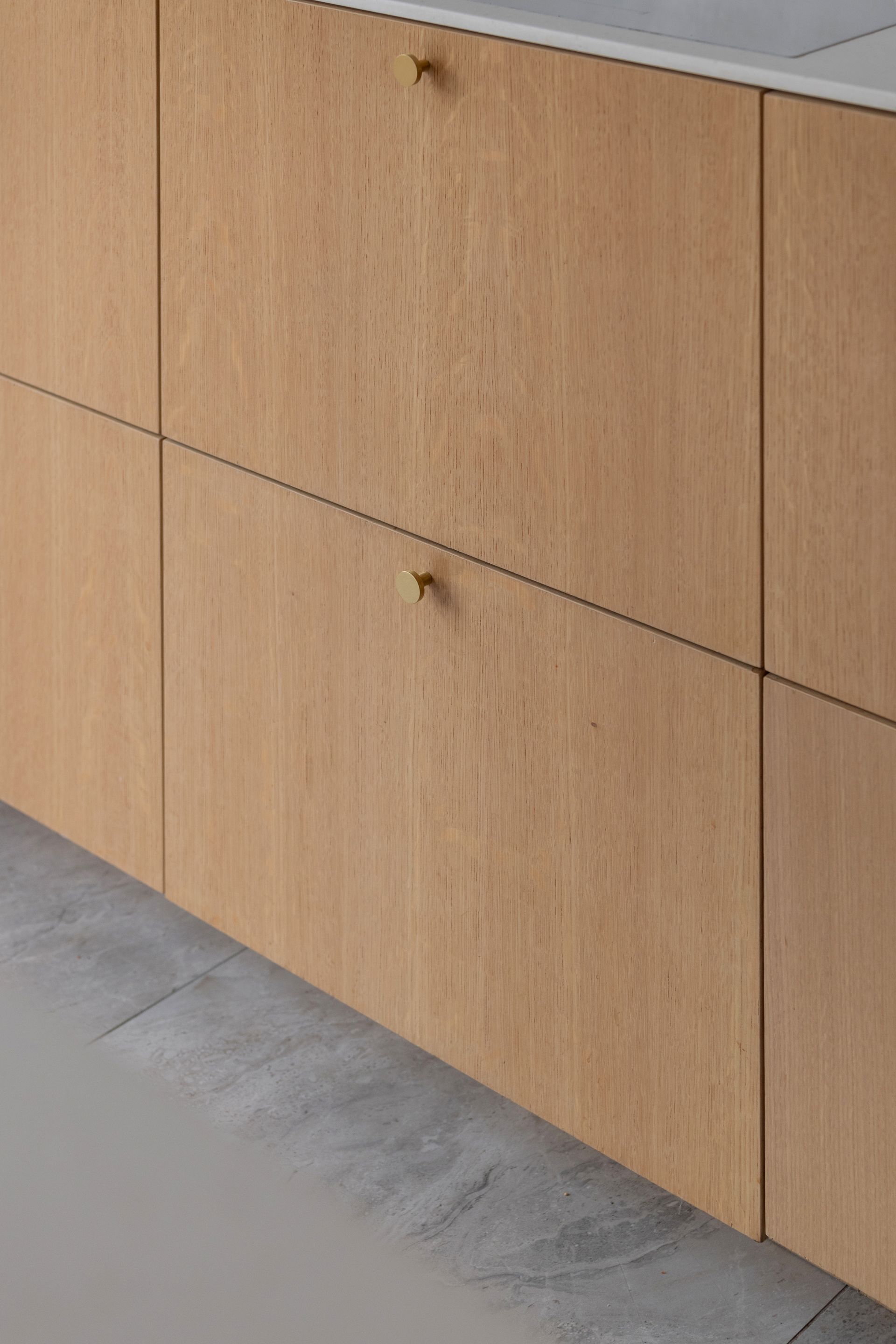 - Caissons de cuisine en bois : pour conserver une atmosphère chaleureuse et visuellement douce, complétés par un plan de travail en Corian, élégant et fonctionnel.