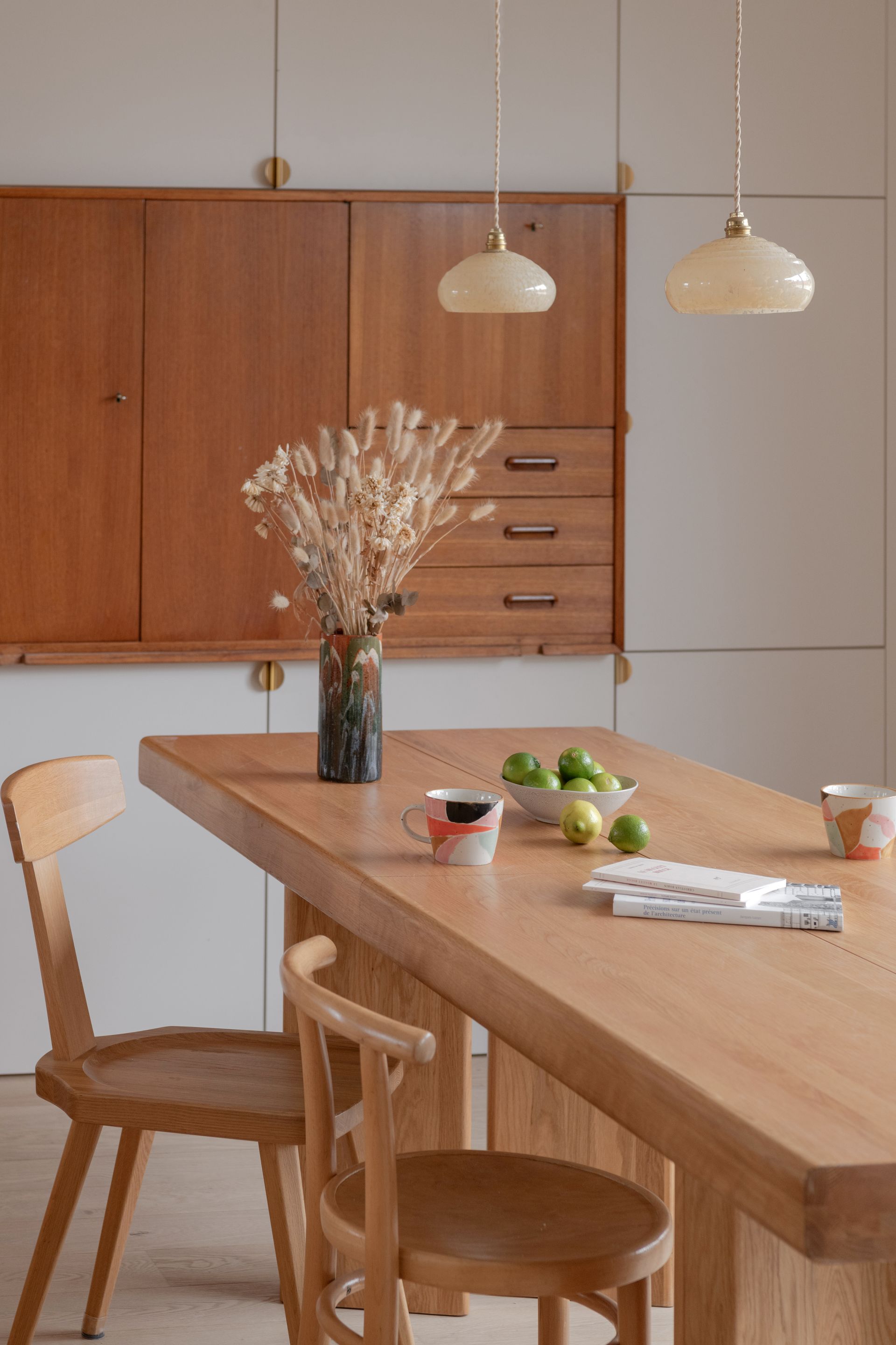 - Suspensions en verre crème : avec un fil tissé assorti aux teintes de l’espace, elles apportent une touche délicate et lumineuse, en parfaite harmonie avec l’ensemble