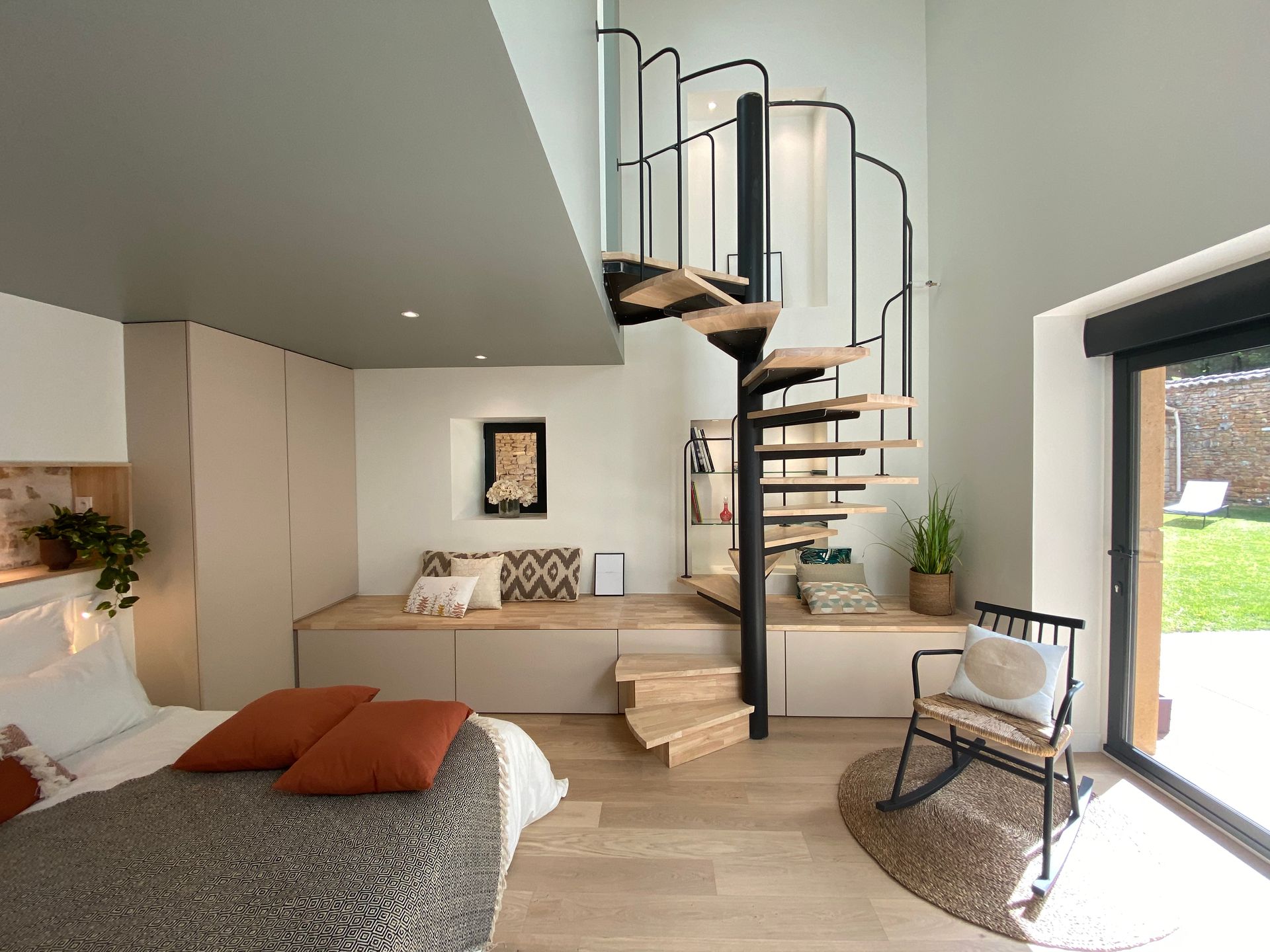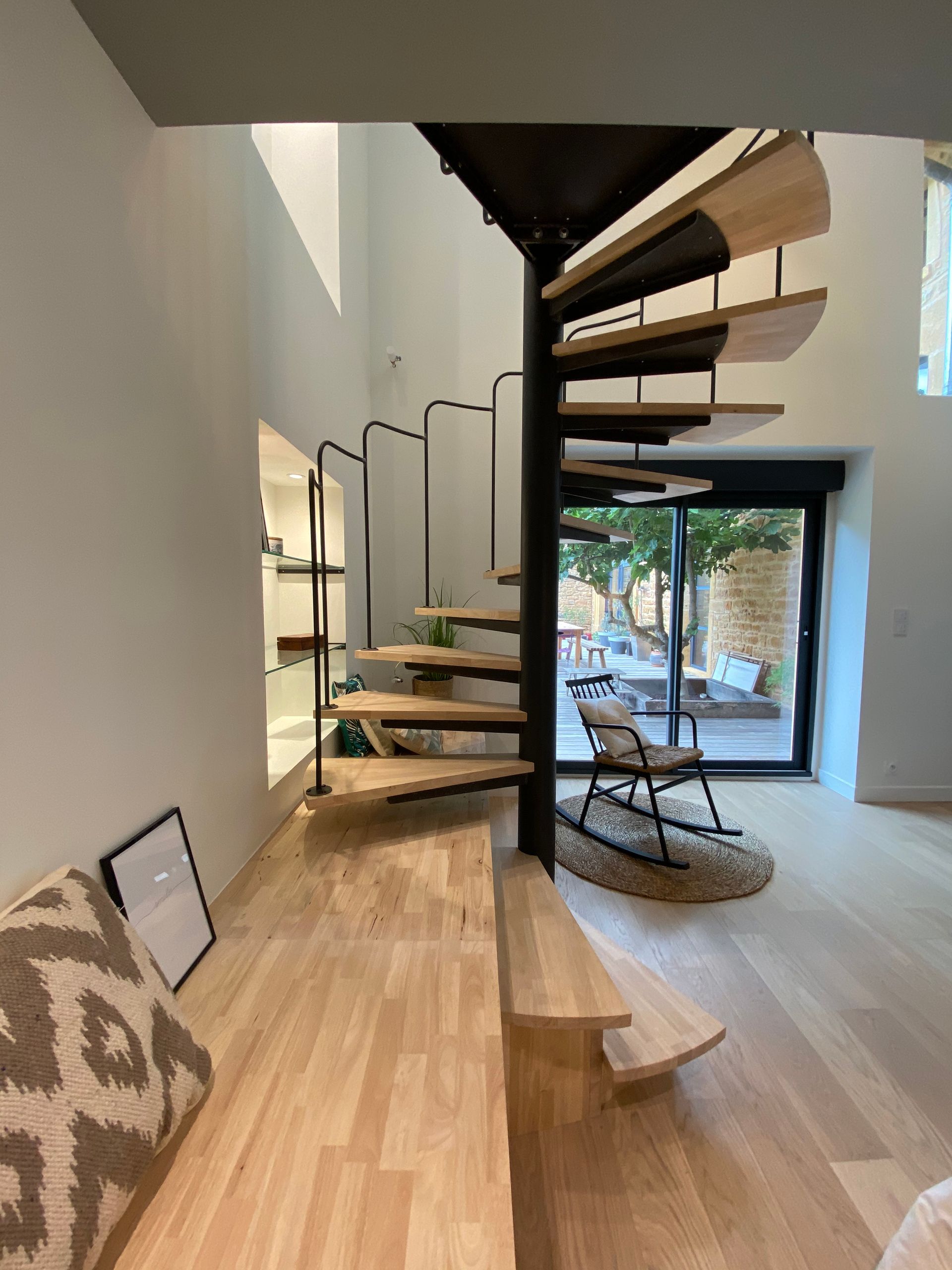 Nous avons ainsi créé une immense banquette créant à la fois du rangement et des assises pour la lecture, mais formant également les premières marches de l'escalier. Cette linéarité offerte par la banquette, devait être contrebalancé par une seconde volée de marches beaucoup plus aériennes, comme suspendues, afin de ne pas perdre la luminosité de la baie vitrée. Et pour gagner de la place, nous l'avons dessiné hélicoïdal, afin de monter plus de marches sur une emprise au sol réduite.