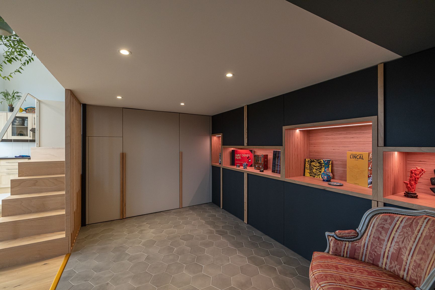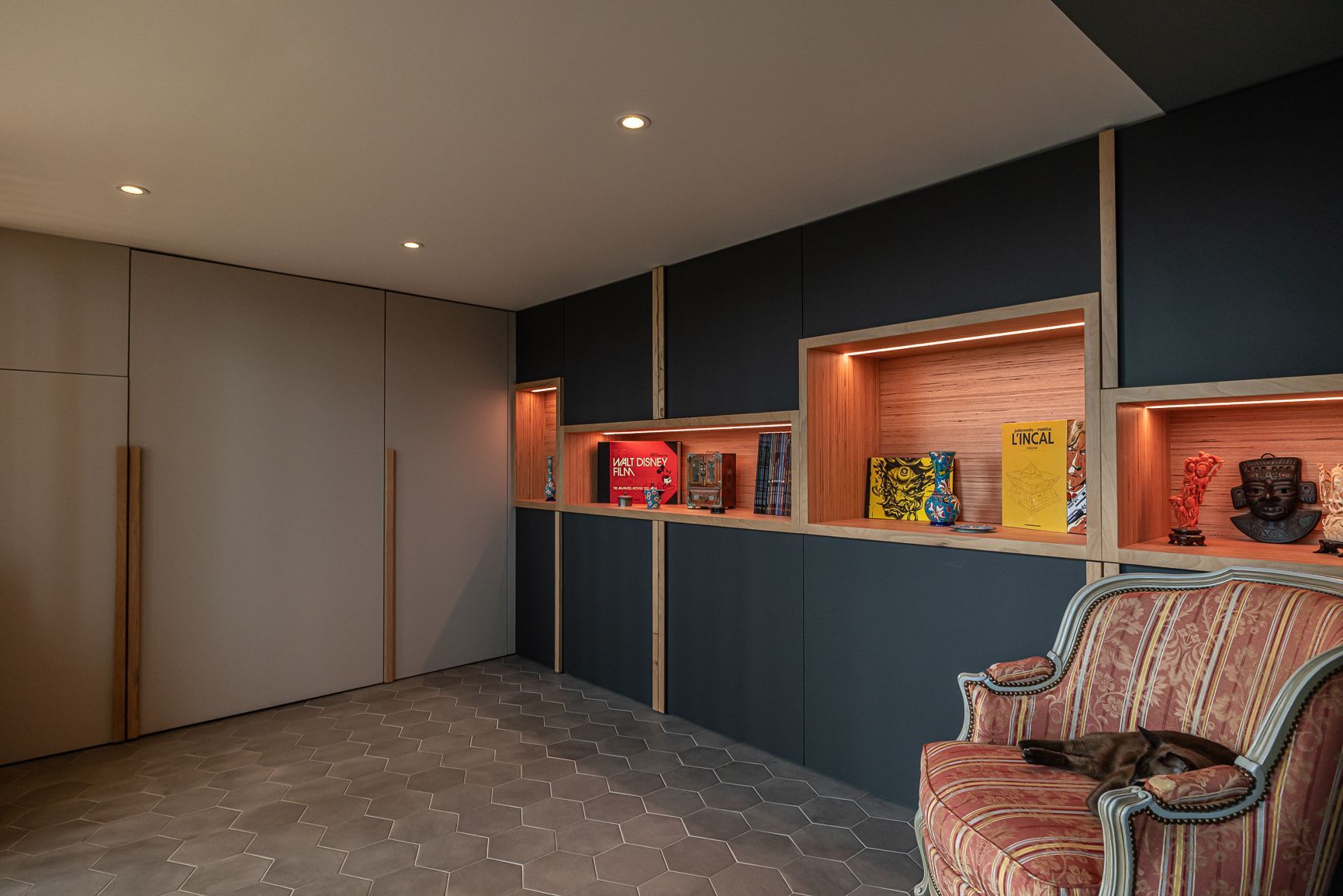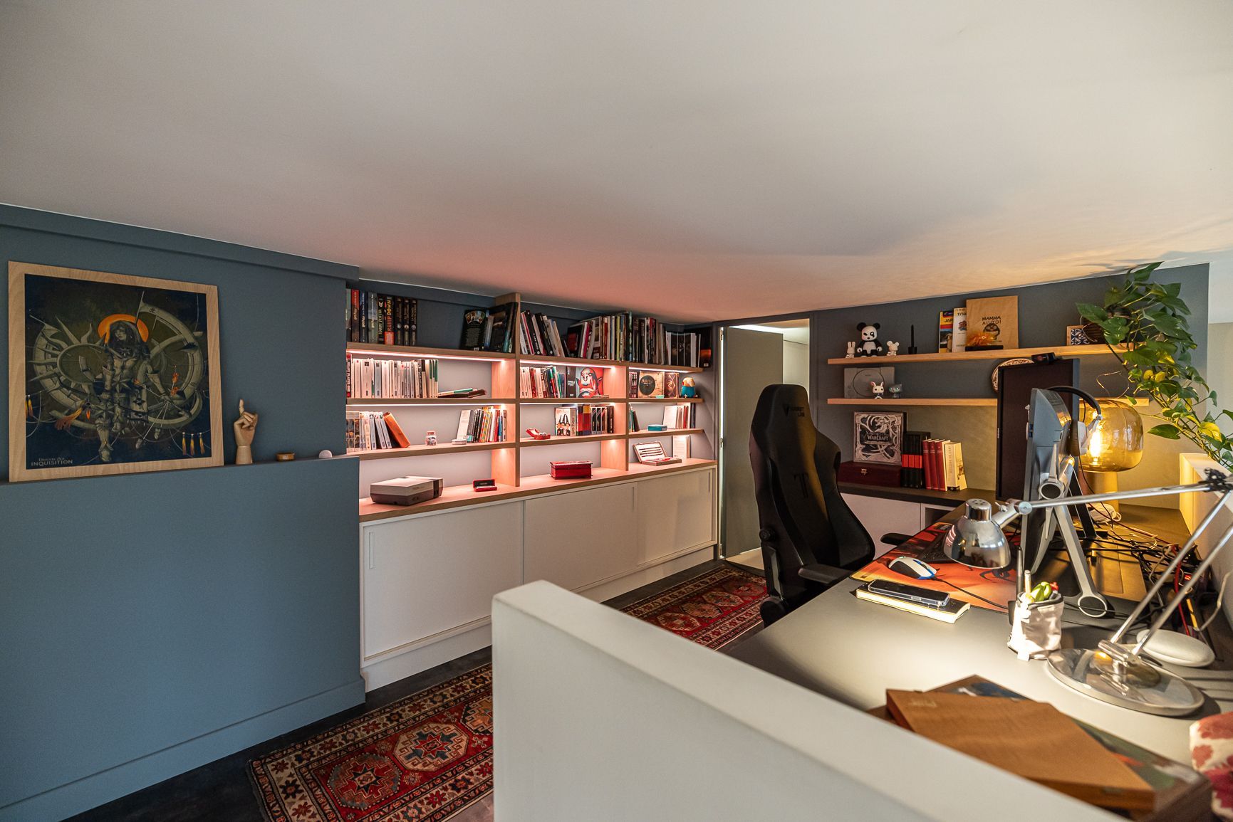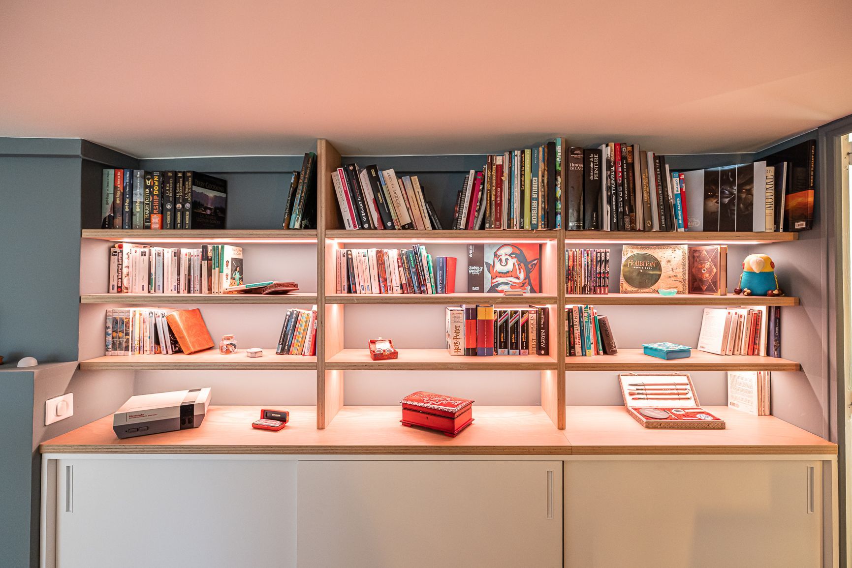 L’optimisation des rangements devient le fil conducteur du projet. Chaque recoin est pensé, chaque volume exploité, grâce à un mobilier largement dessiné sur mesure. Bibliothèques, rangements bas, meubles multifonctions ou intégrés à l’architecture permettent d’absorber le quotidien sans l’exposer, tout en donnant une identité forte et singulière à l’appartement.