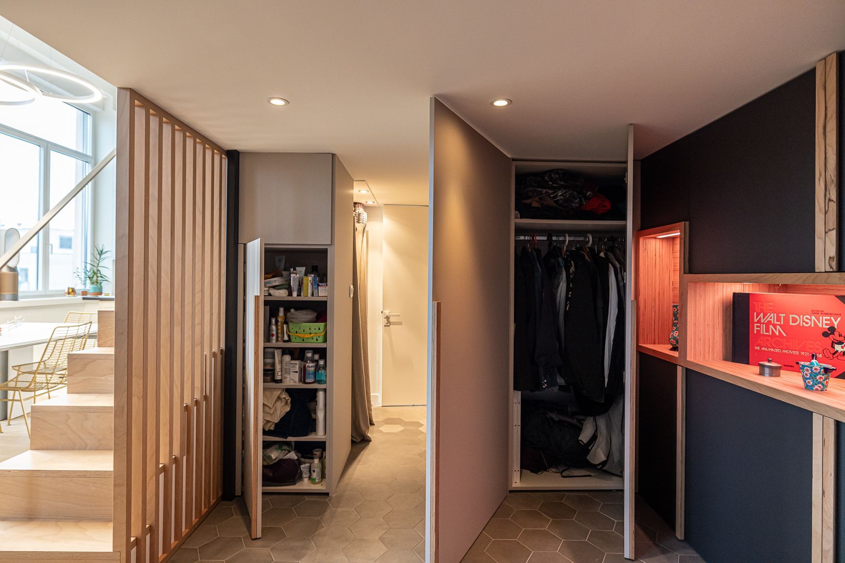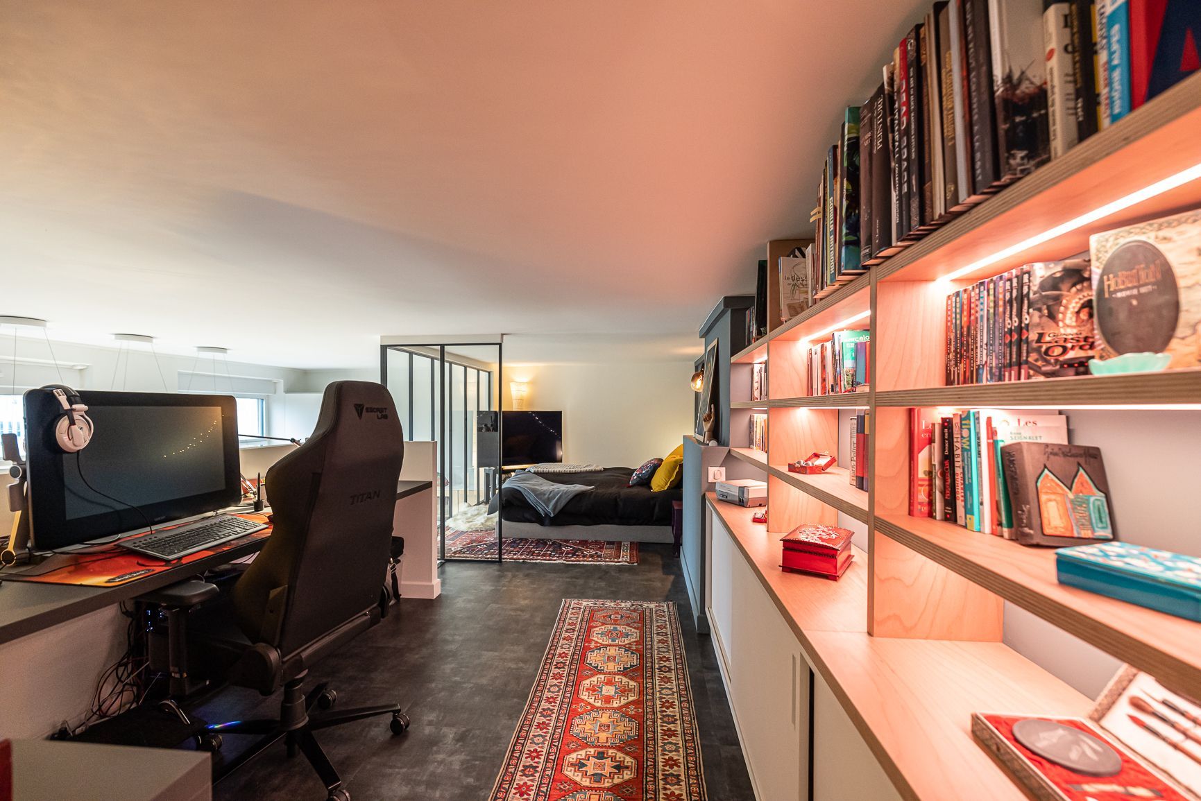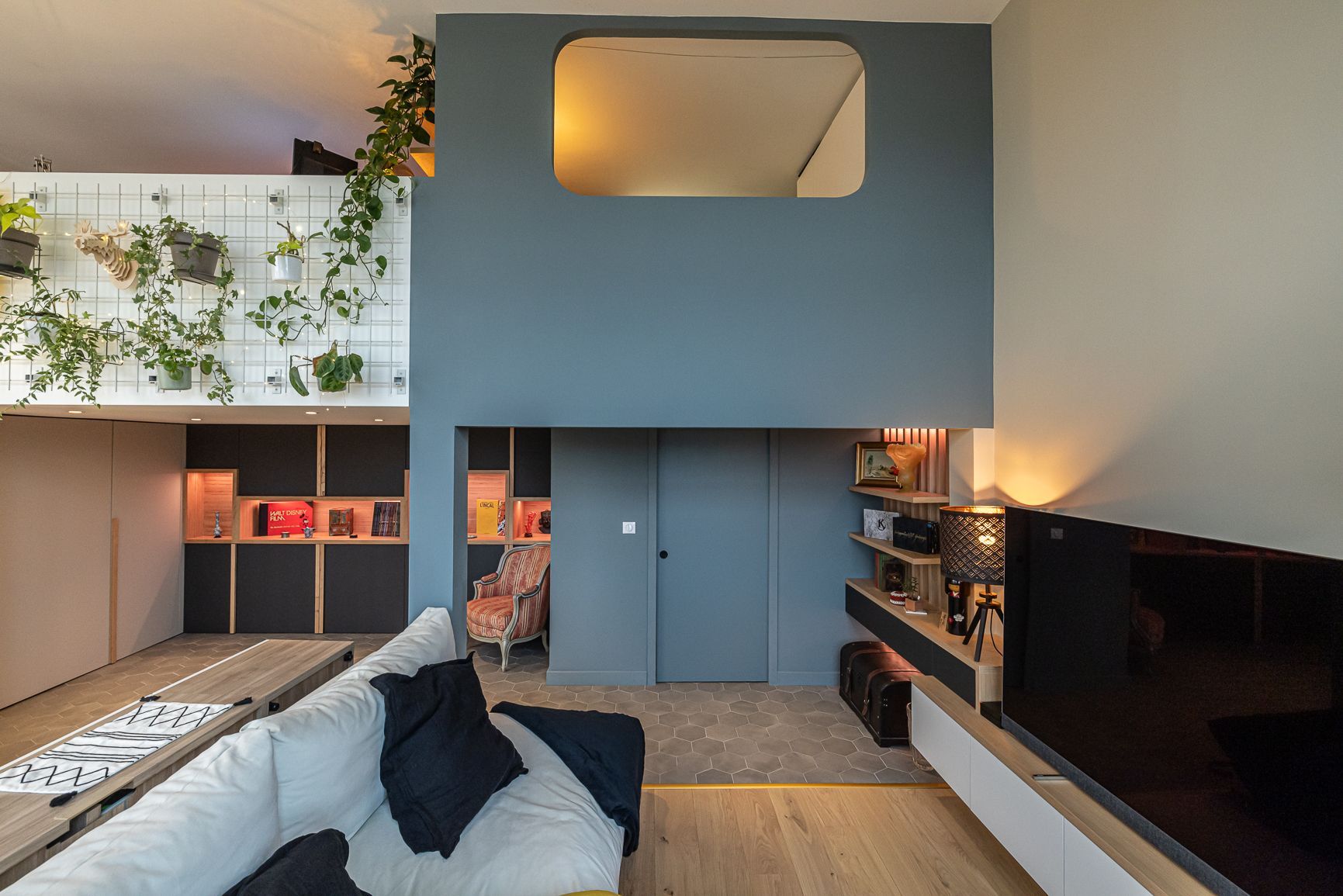 L’optimisation des rangements devient le fil conducteur du projet. Chaque recoin est pensé, chaque volume exploité, grâce à un mobilier largement dessiné sur mesure. Bibliothèques, rangements bas, meubles multifonctions ou intégrés à l’architecture permettent d’absorber le quotidien sans l’exposer, tout en donnant une identité forte et singulière à l’appartement.