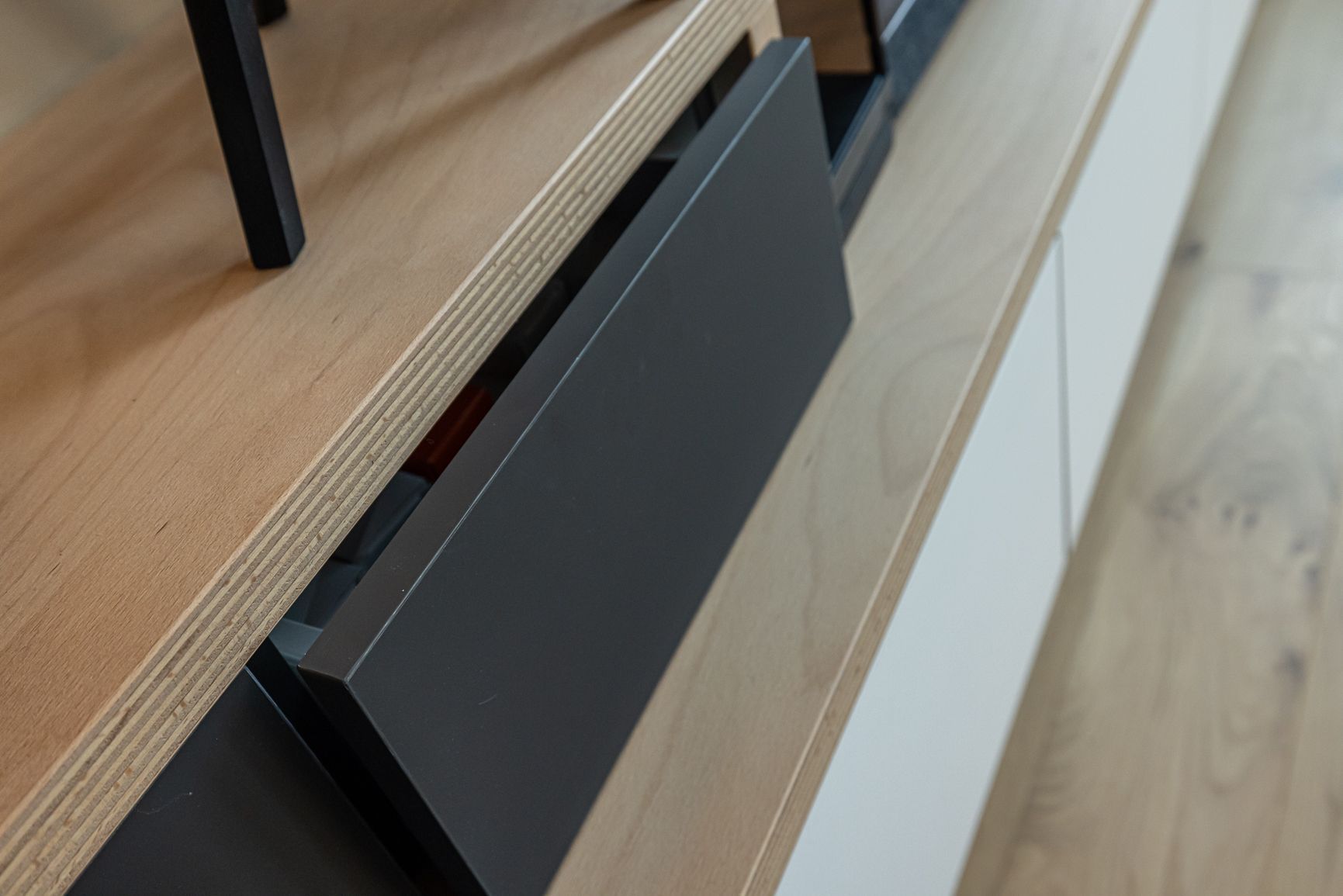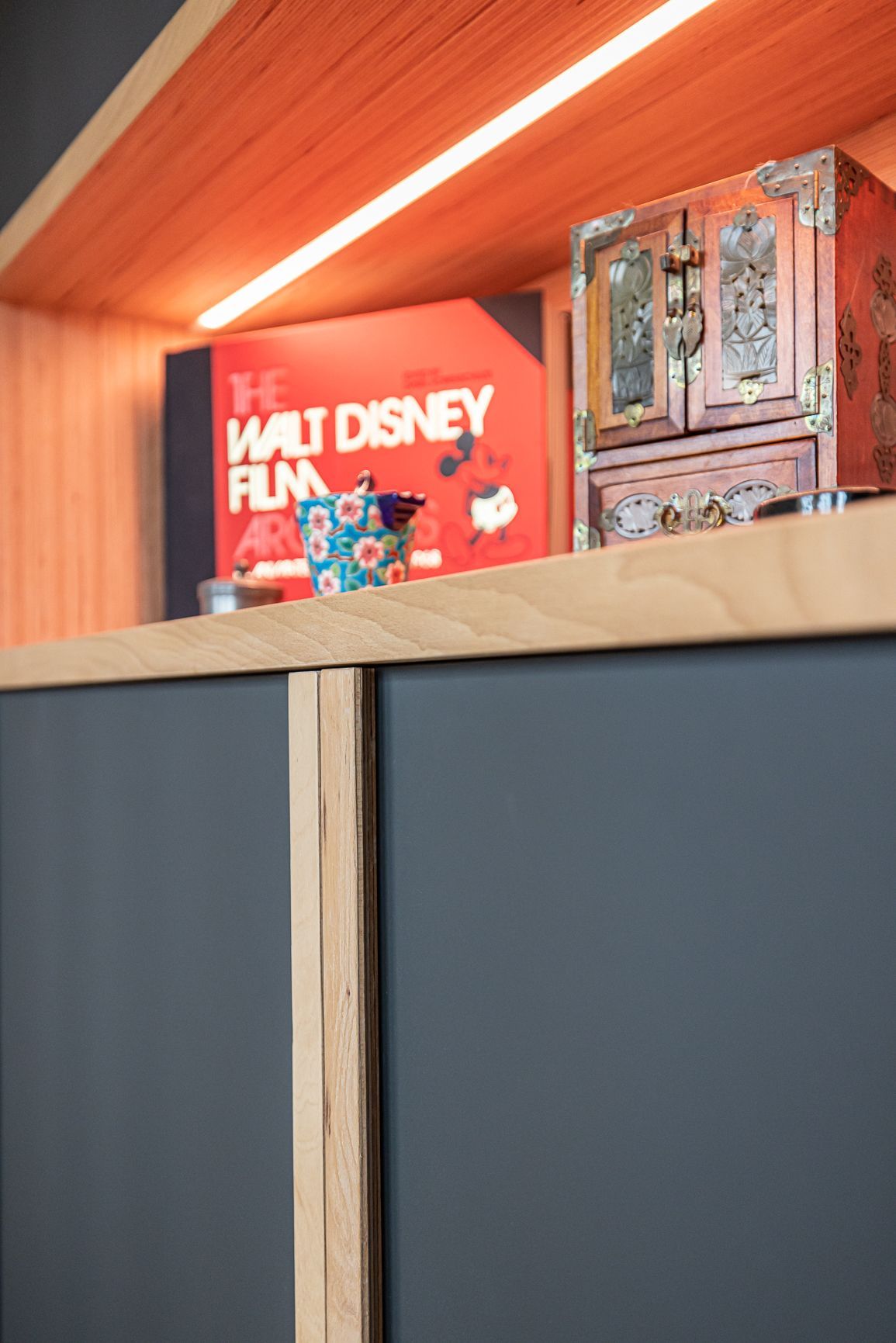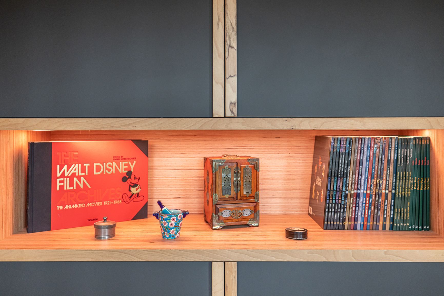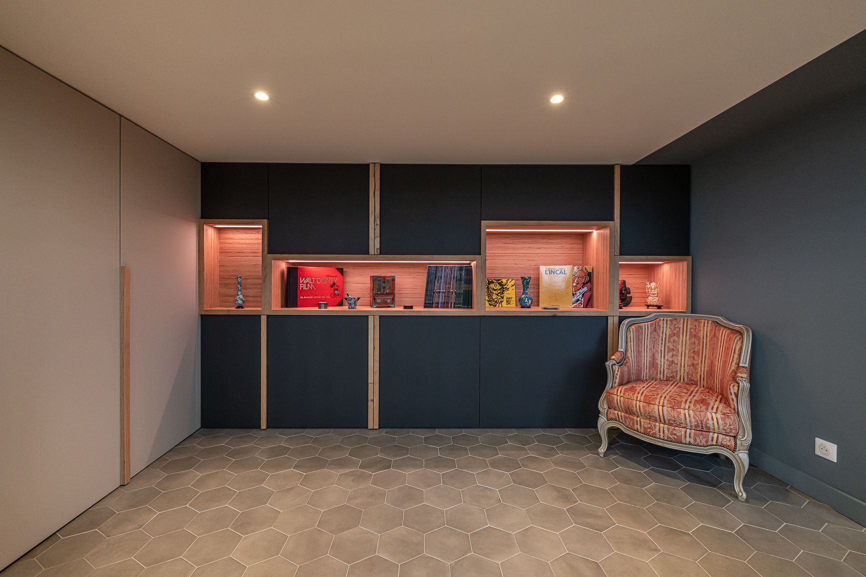 L’optimisation des rangements devient le fil conducteur du projet. Chaque recoin est pensé, chaque volume exploité, grâce à un mobilier largement dessiné sur mesure. Bibliothèques, rangements bas, meubles multifonctions ou intégrés à l’architecture permettent d’absorber le quotidien sans l’exposer, tout en donnant une identité forte et singulière à l’appartement.