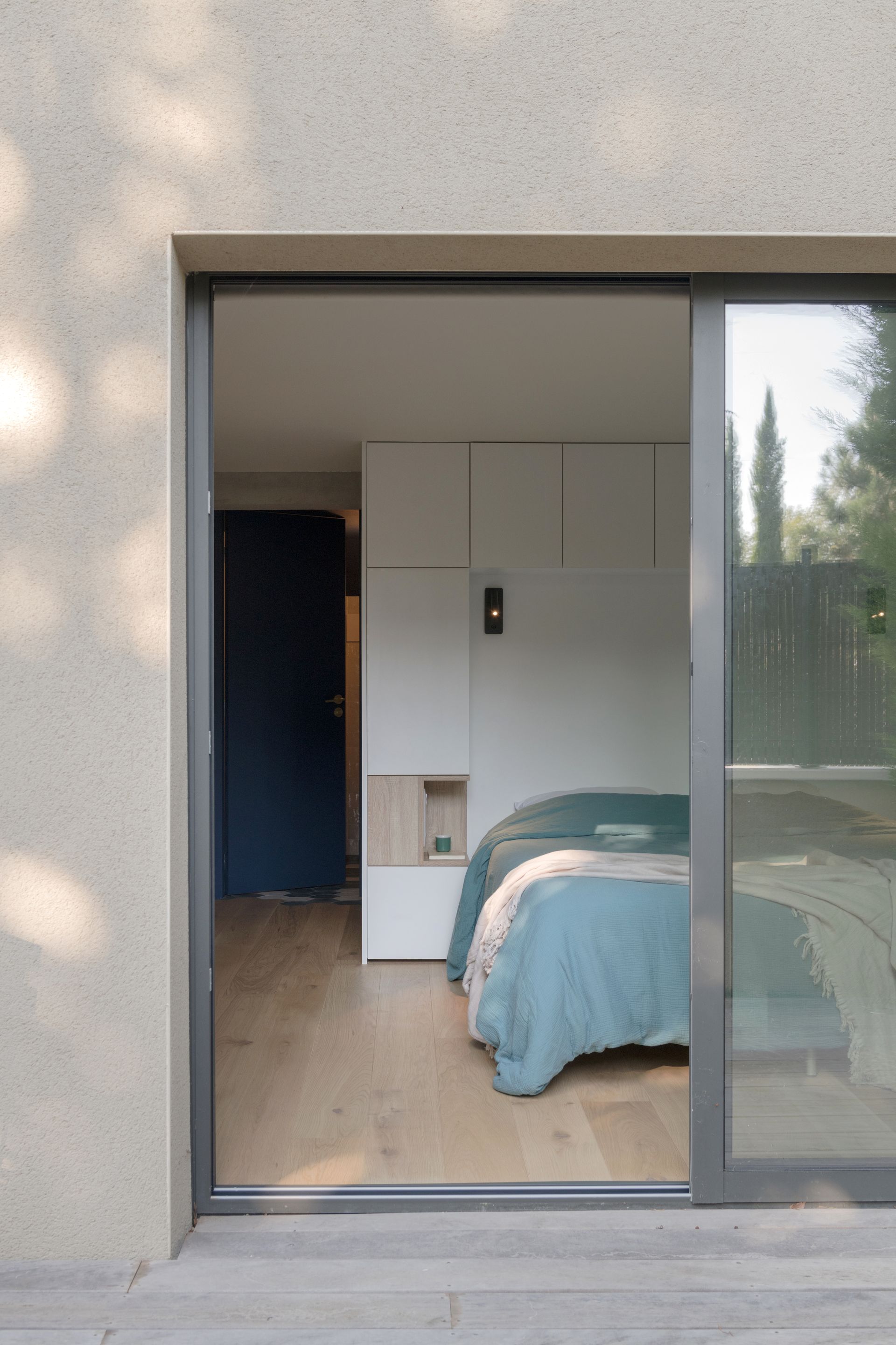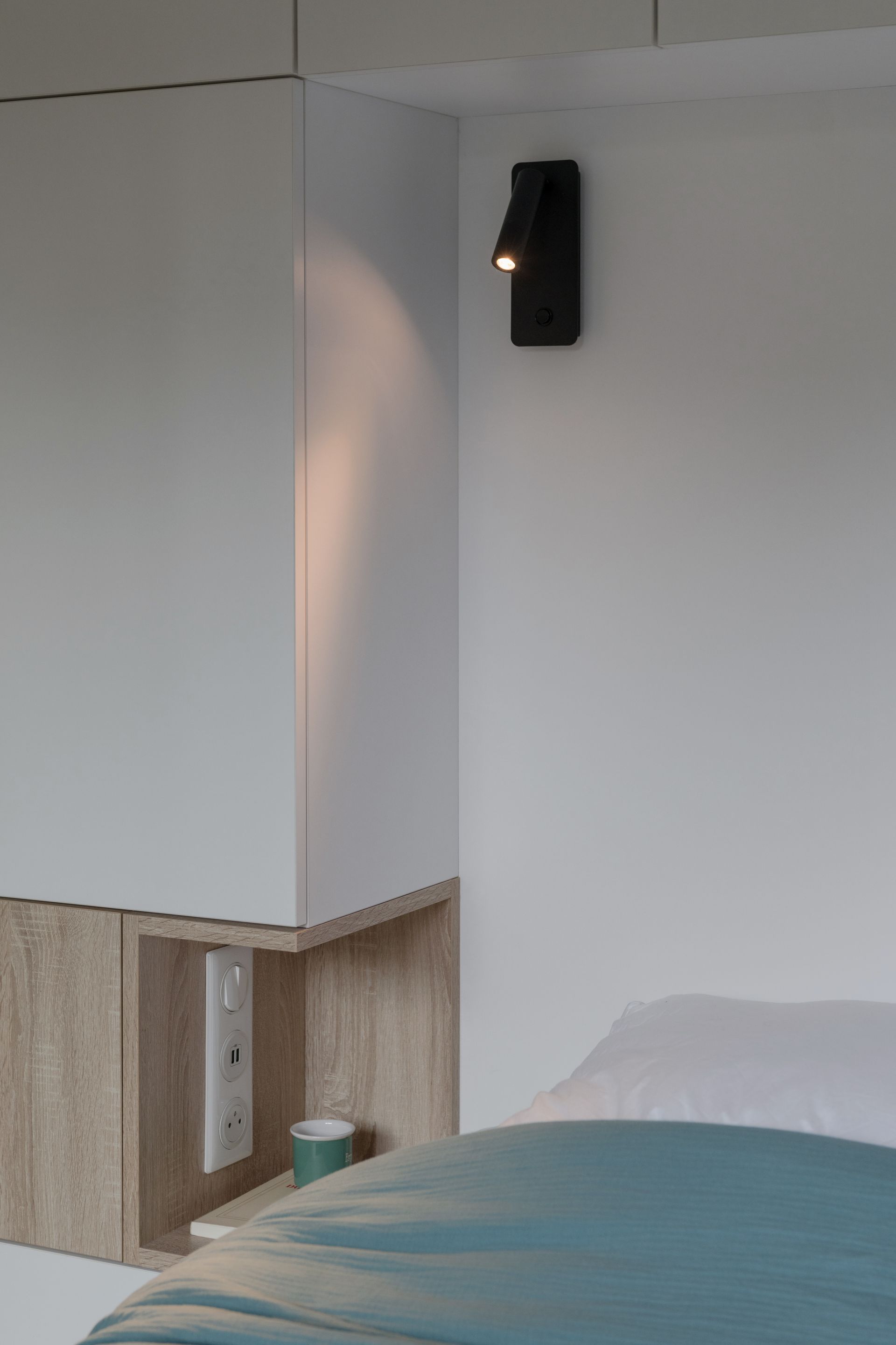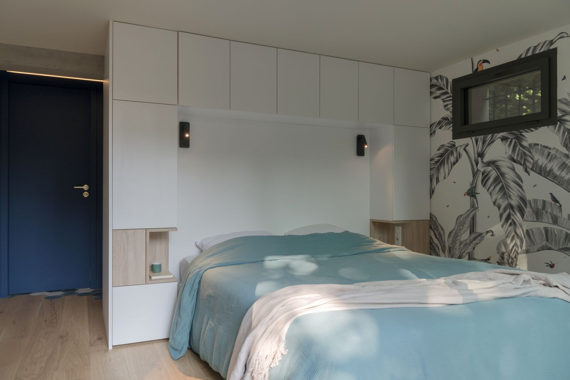 Le projet s’appuie sur la transformation d’un espace existant, repensé pour accueillir des usages multiples et adaptés au quotidien. L’aménagement intérieur privilégie des volumes fonctionnels et lumineux, avec la création d’une chambre pensée comme un espace à la fois confortable et pratique. Des rangements intégrés ont été conçus sur mesure, notamment dans la tête de lit et les circulations, afin d’optimiser chaque mètre carré.