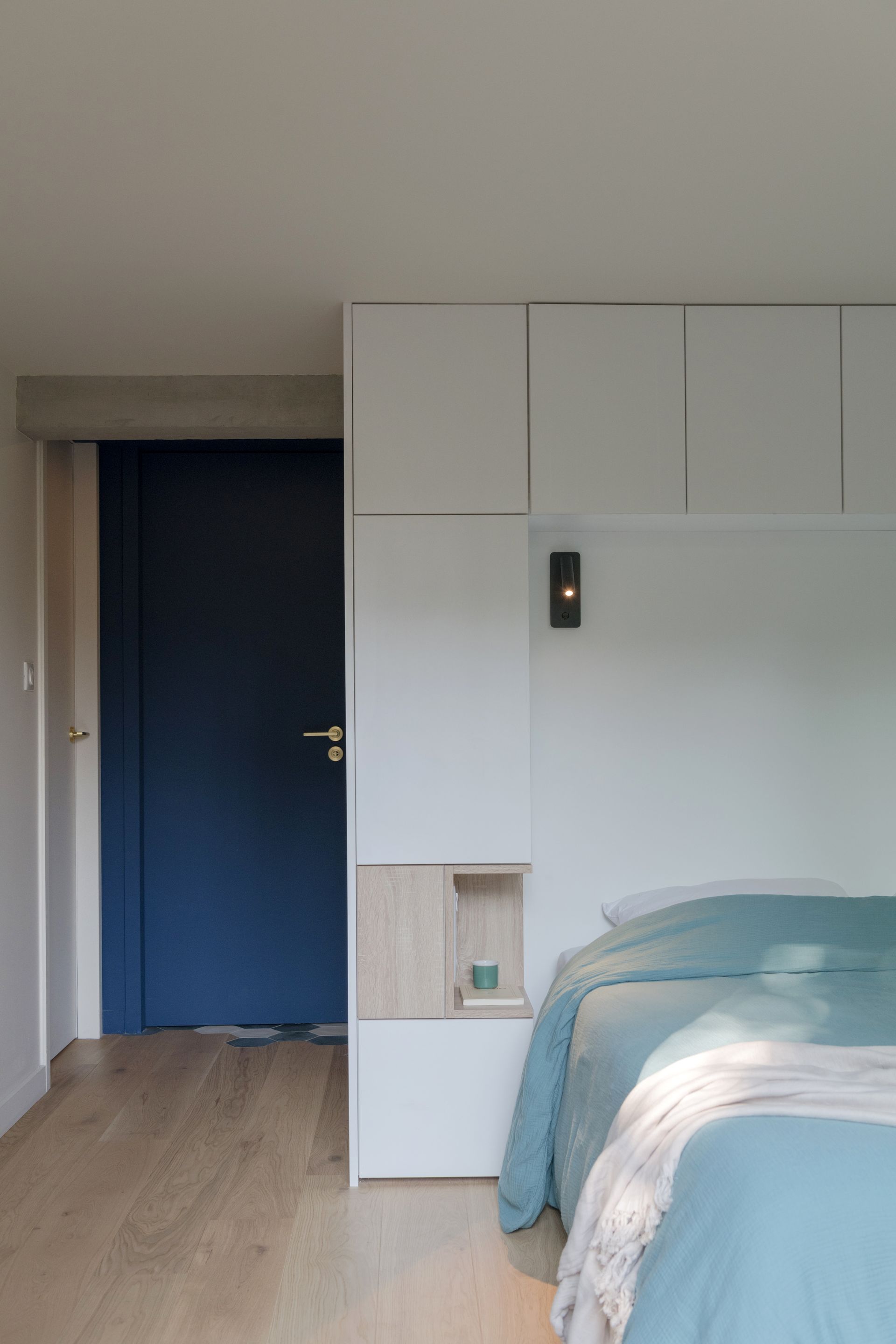 L’aménagement intègre de nombreux rangements sur mesure, conçus pour s’adapter précisément aux volumes existants. Dans la chambre, le dressing et les circulations, ces solutions personnalisées permettent d’optimiser l’espace, de fluidifier les usages et de conserver une lecture claire et ordonnée des volumes.