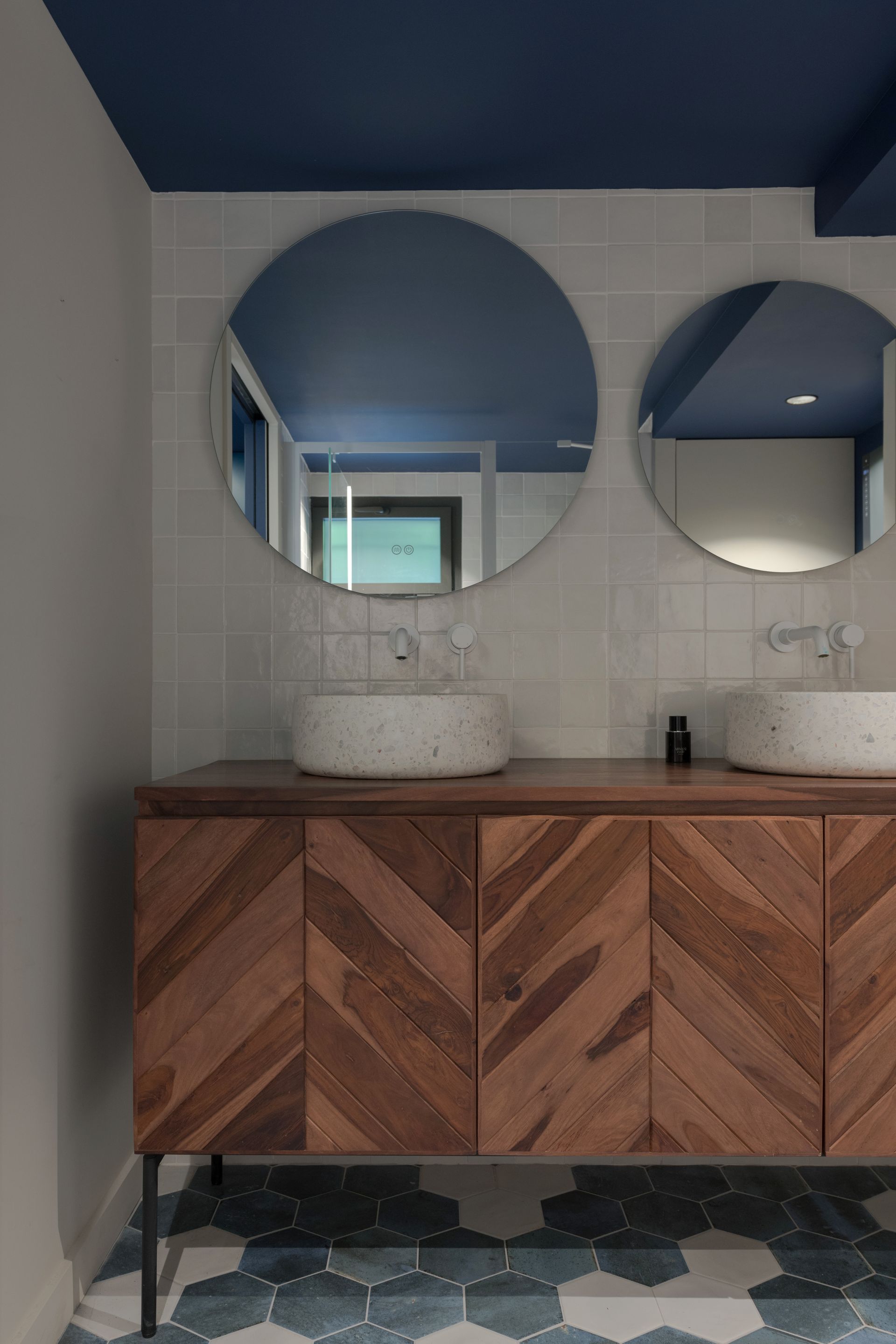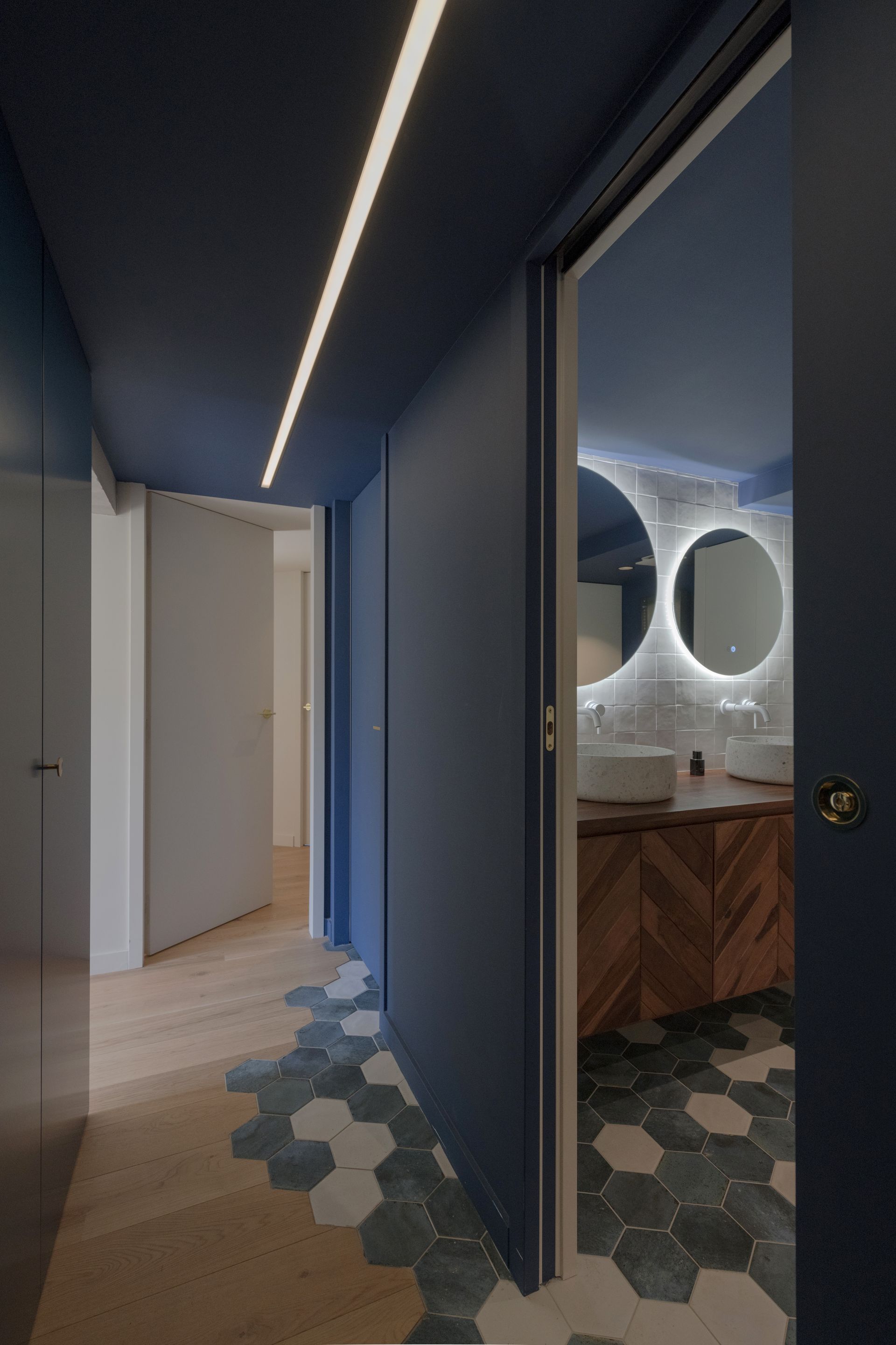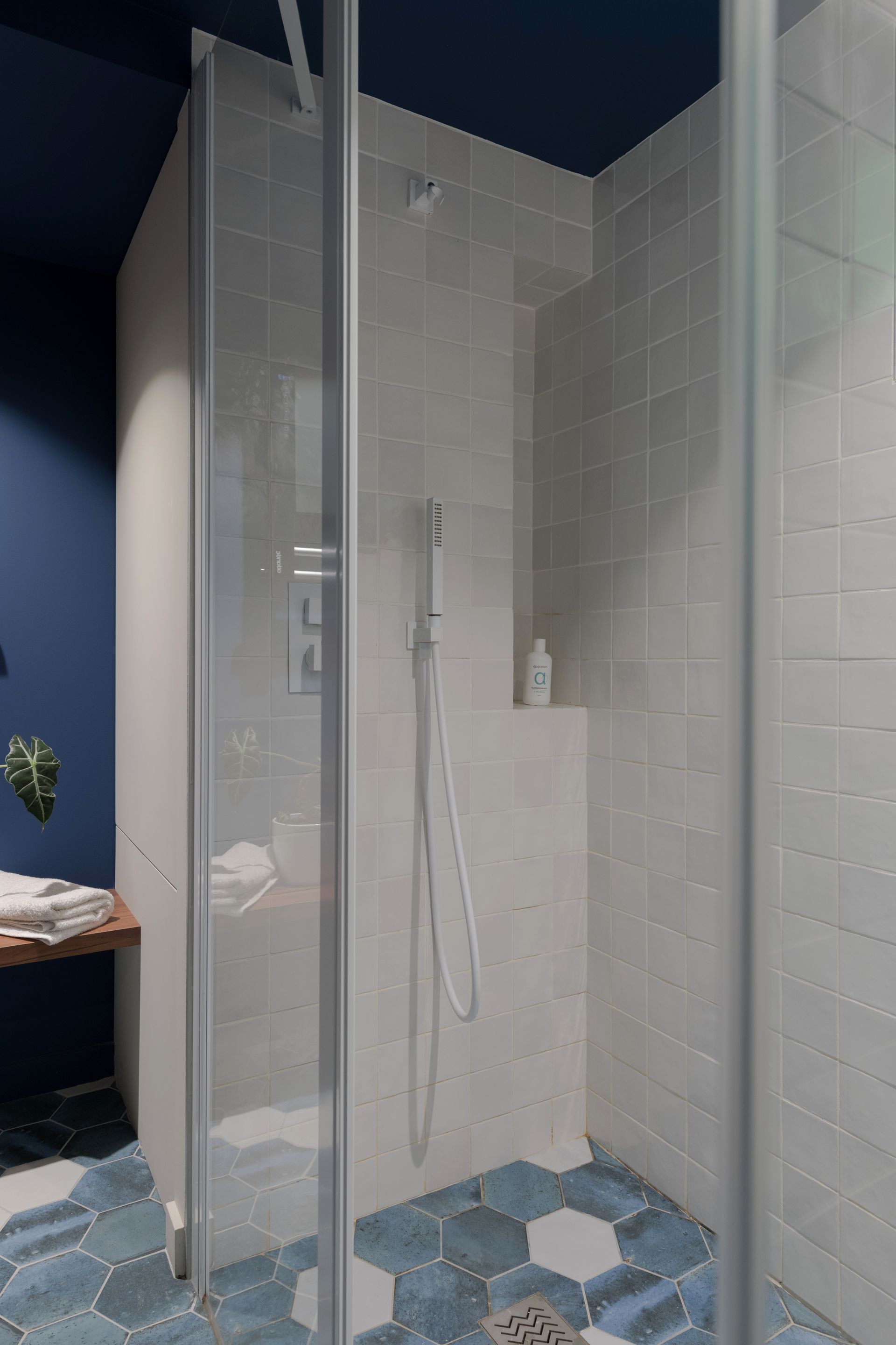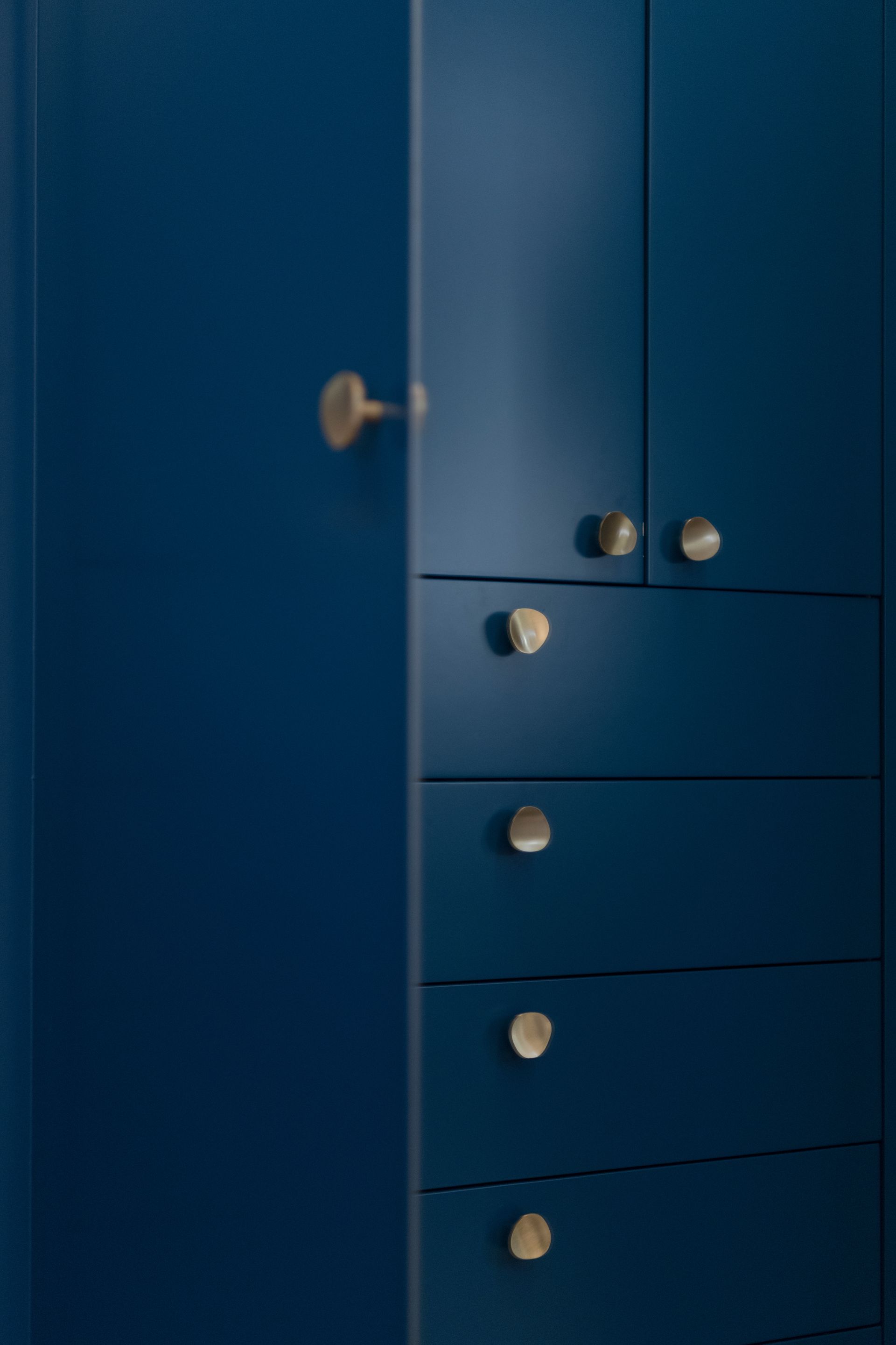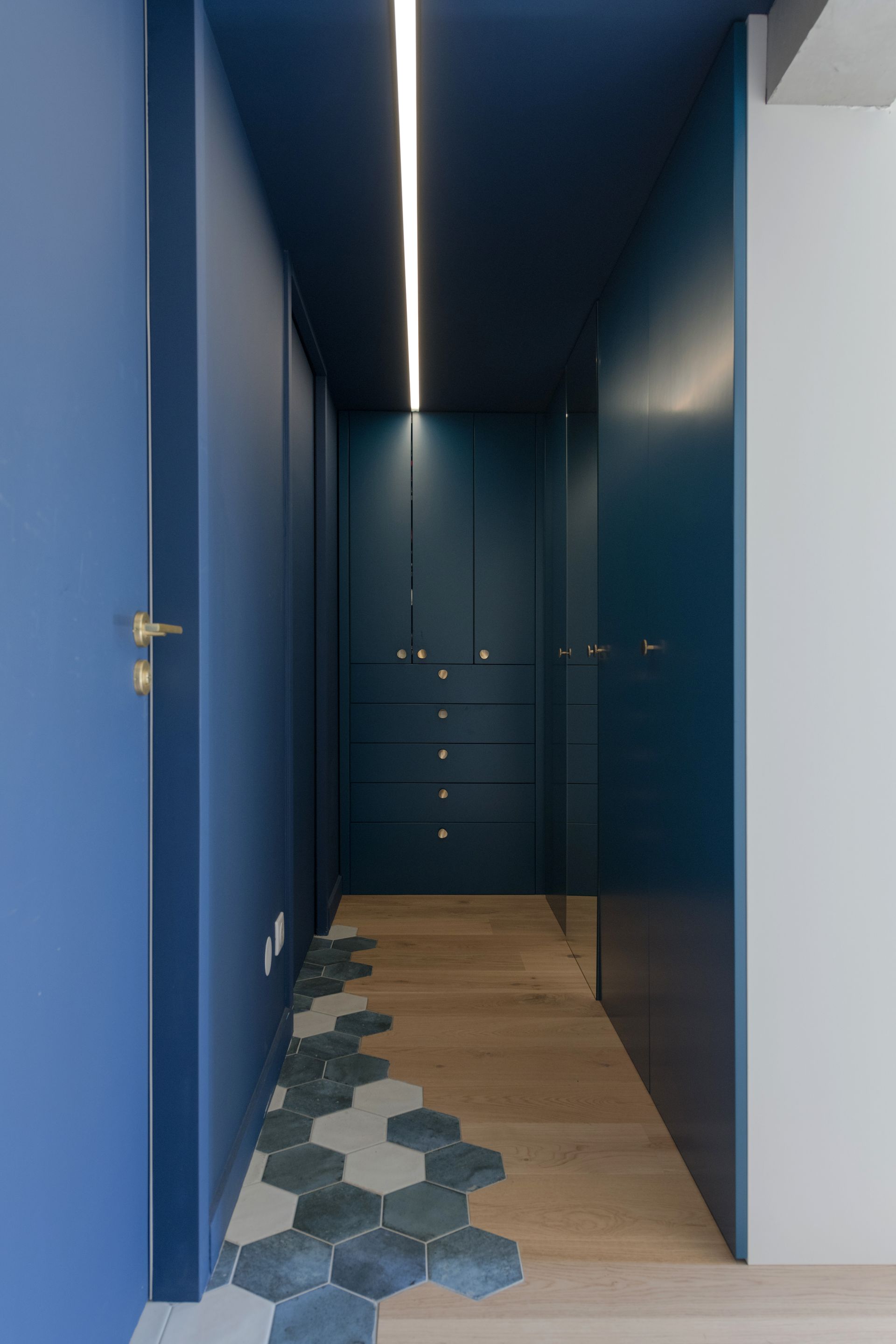 Le bleu a été choisi comme fil conducteur de l’aménagement de la suite parentale, du dressing et de la salle d’eau. Décliné dans différentes nuances, il apporte une atmosphère apaisante et cohérente à l’ensemble, favorisant le calme et le bien-être. Cette couleur, reconnue pour ses vertus relaxantes, structure les espaces tout en affirmant une identité forte et contemporaine.