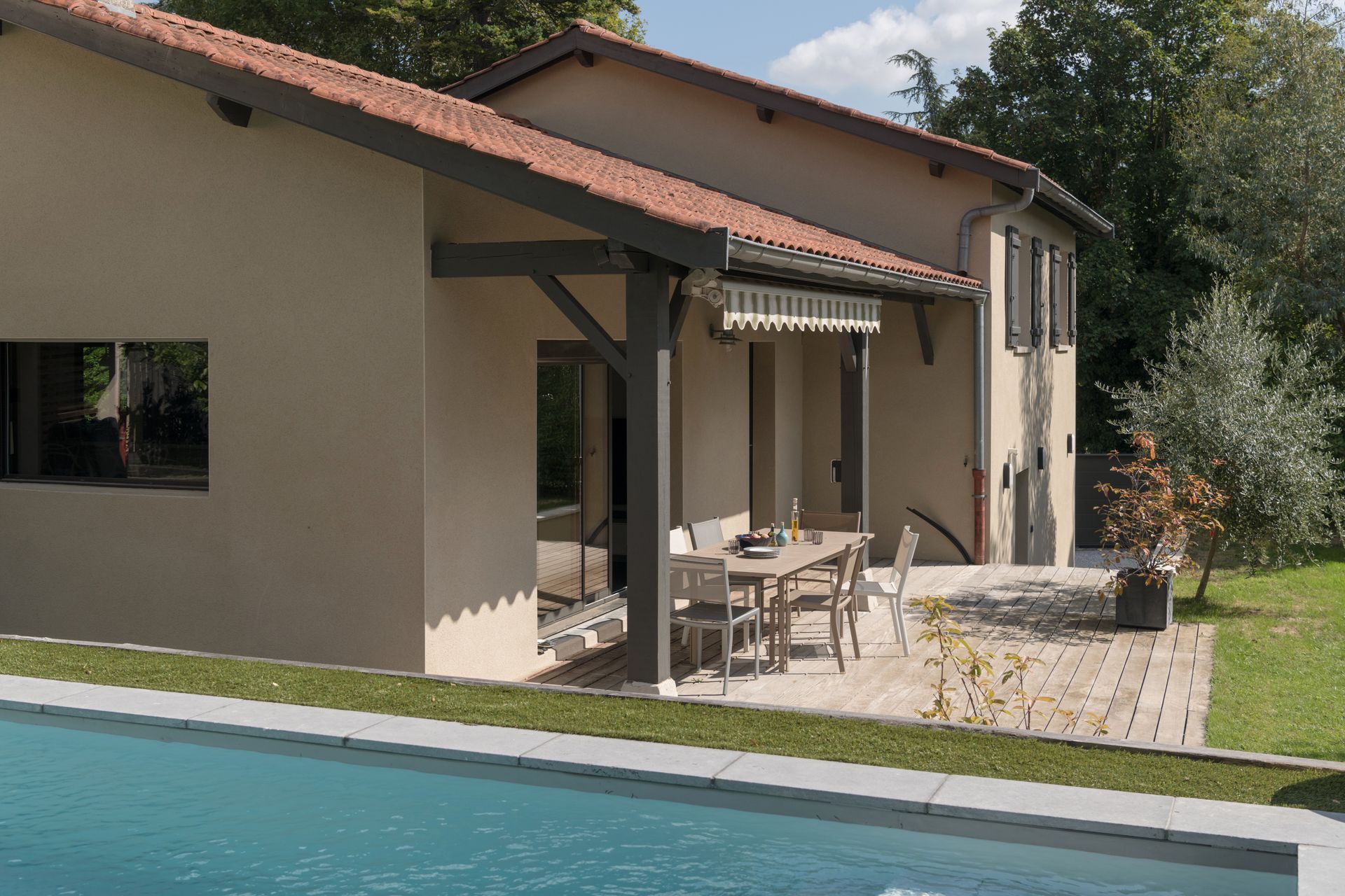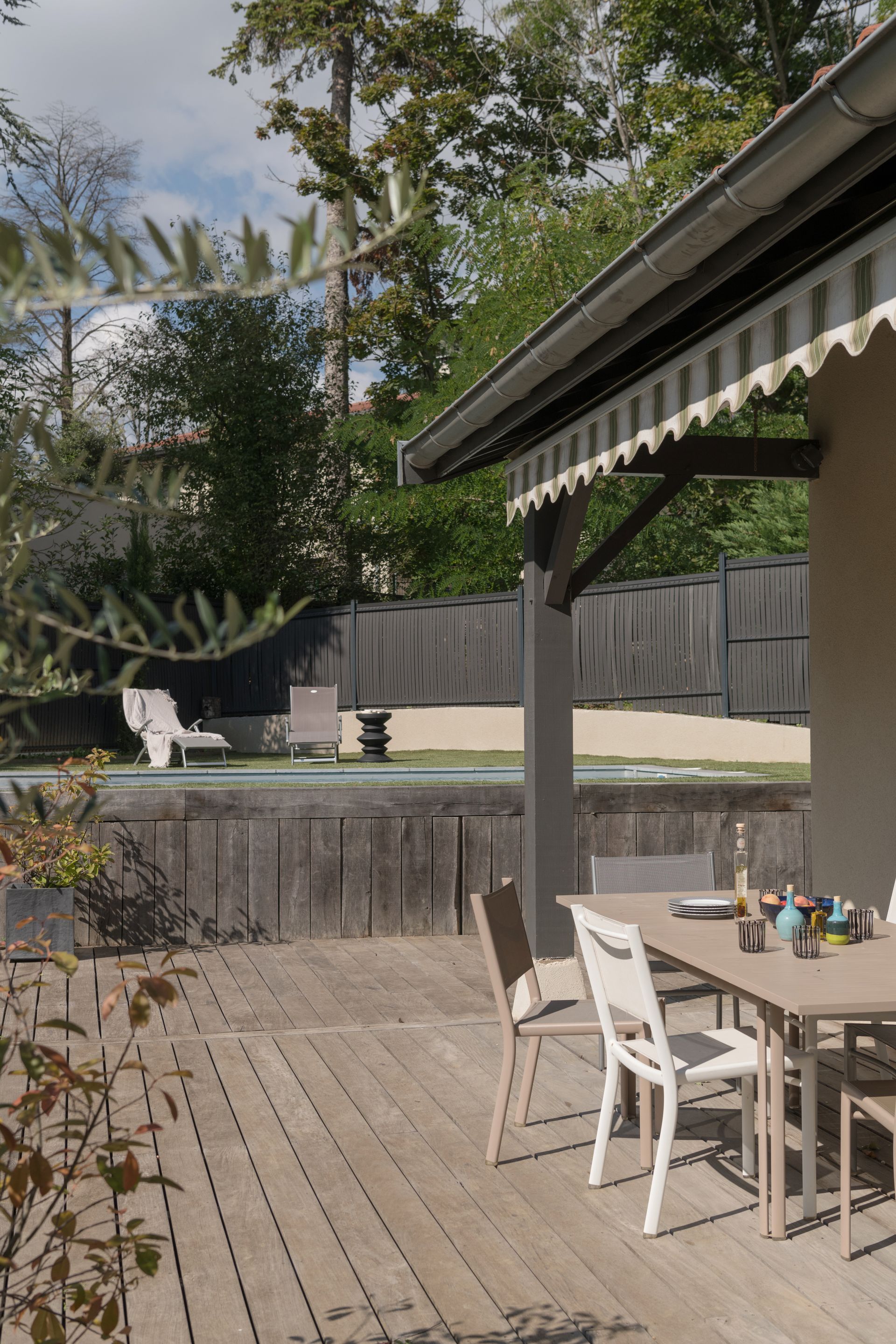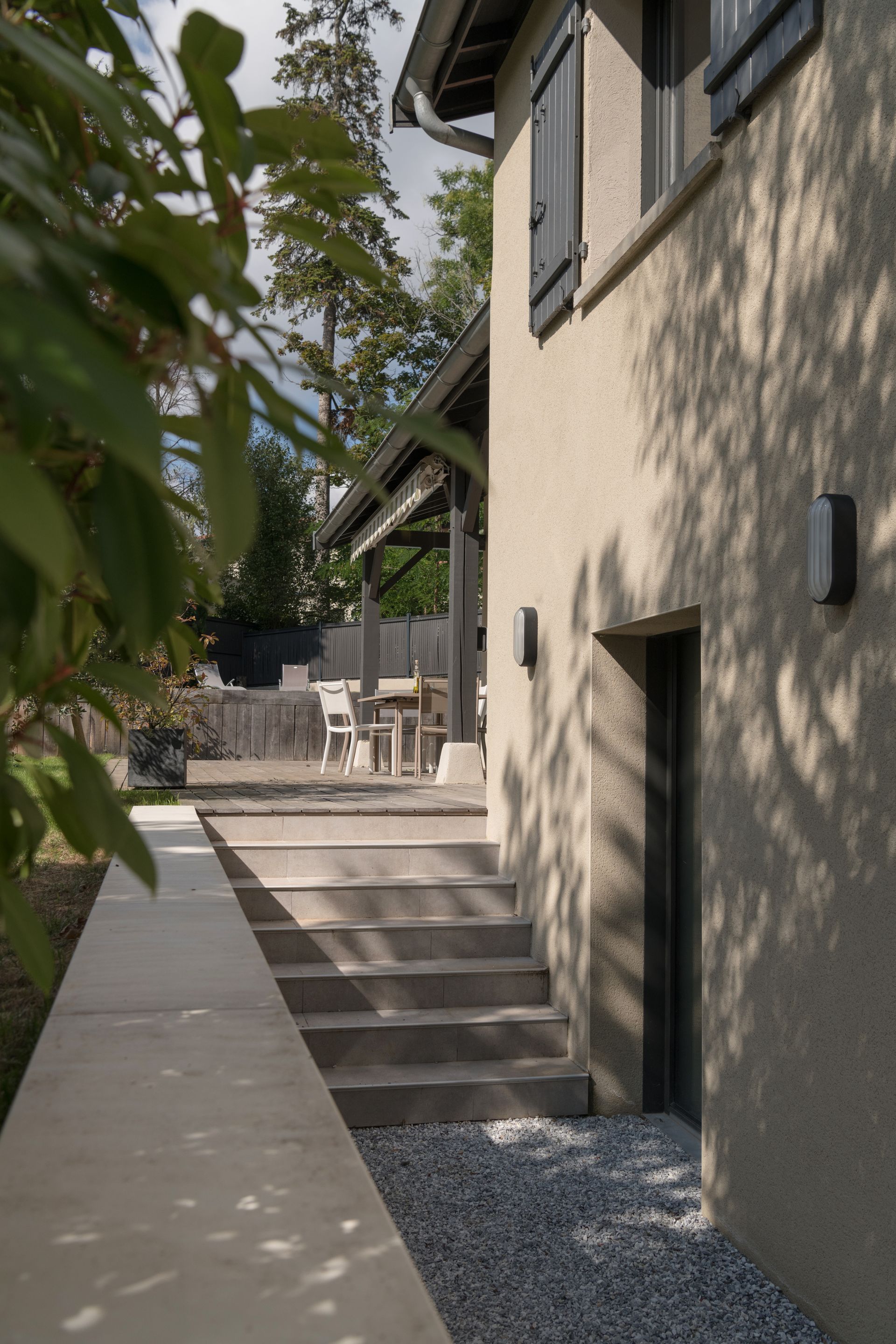 Les espaces extérieurs ont fait l’objet d’une réflexion globale. La création d’une piscine vient enrichir les usages et renforcer le lien entre la maison et le jardin. Les terrasses en bois ont été entièrement reprises afin d’offrir des espaces extérieurs qualitatifs et durables, tandis qu’un ravalement de façade permet de redonner une unité et une nouvelle lecture à l’ensemble du bâti.
