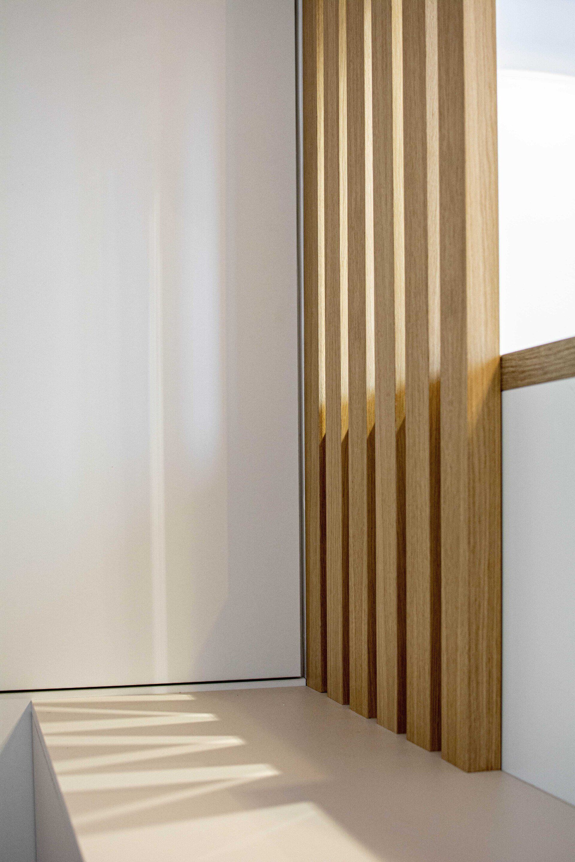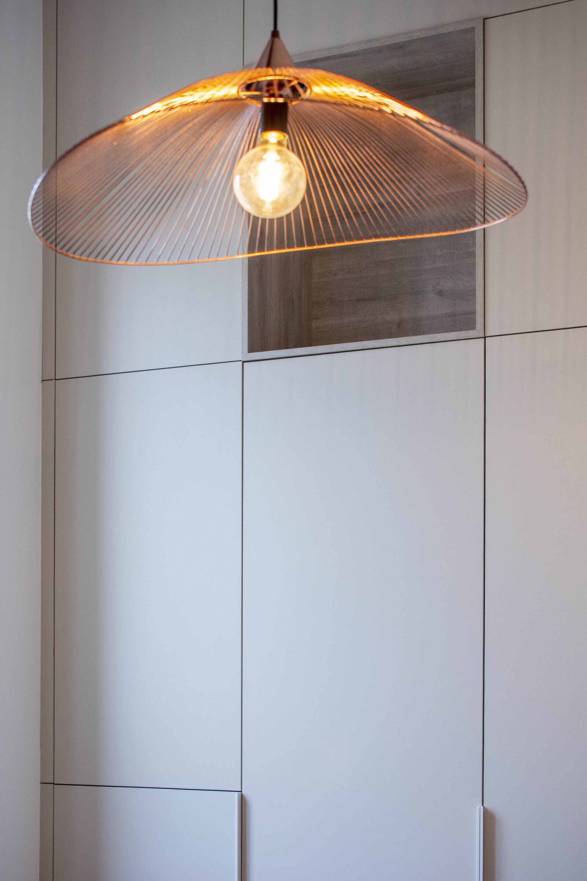 L'entrée est un espace primordial à ne pas négliger. En effet, pour les invités, elle marque la première impression, et pour le quotidien, elle doit être fonctionnelle et accueillante. Nous avons alors créé une première zone banquette, permettant de s'assoir lorsque l'on se déchausse, très ouverte sur la pièce à vivre. Une fine claustra vient isoler la partie technique de la cuisson de la cuisine, et crée un espace tampon filtrant les fonctions, mais pas la lumière. En face de la porte d'entrée, une porte cachée par une façade miroir, vient dissimuler la penderie.