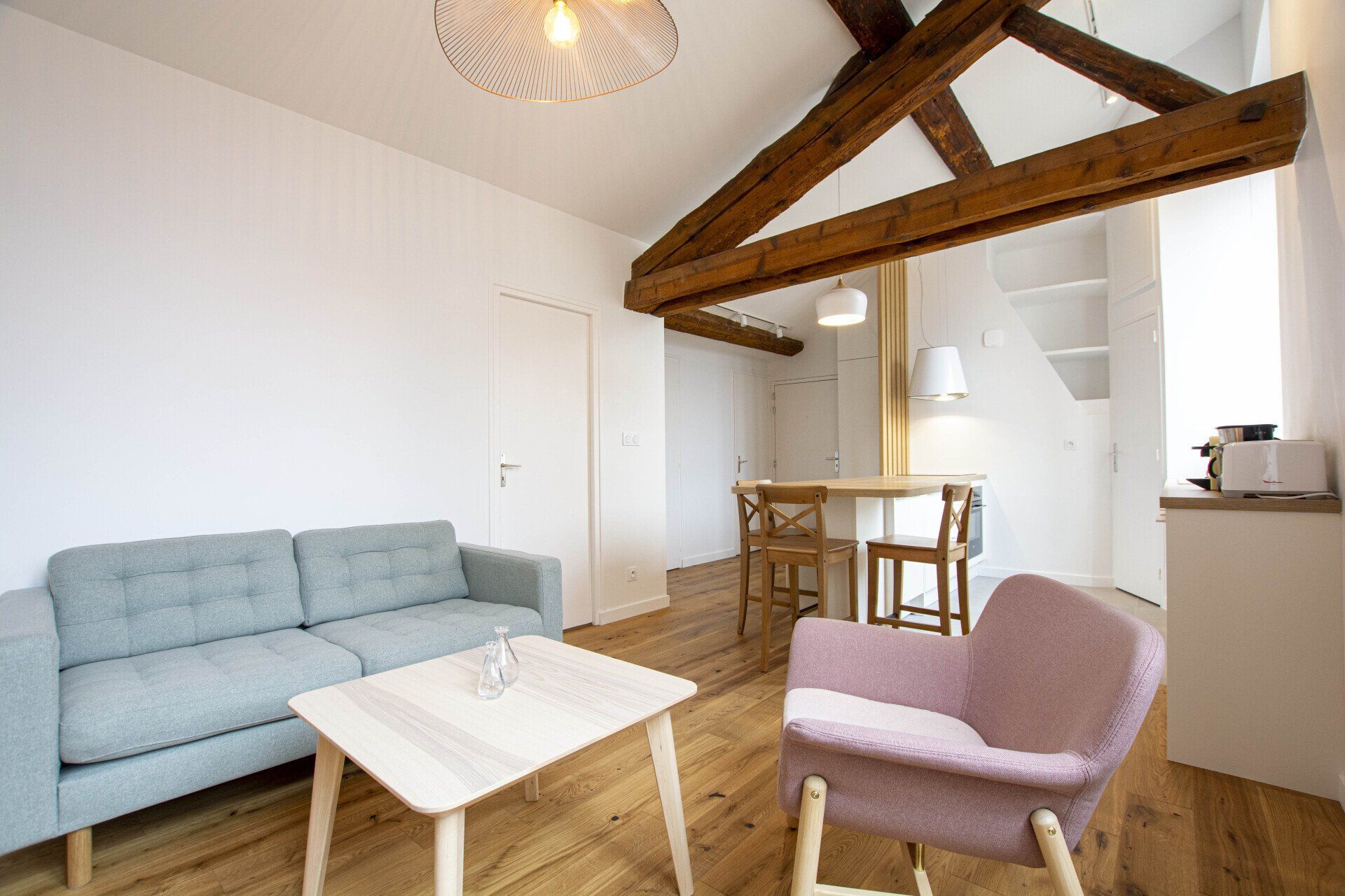 Au sol, un parquet a été posé sur l'ensemble des pièces à vivre et des chambres, afin de créer une harmonie et un espace plus chaleureux. Le contraste avec la charpente existante, restaurée, est saisissant.