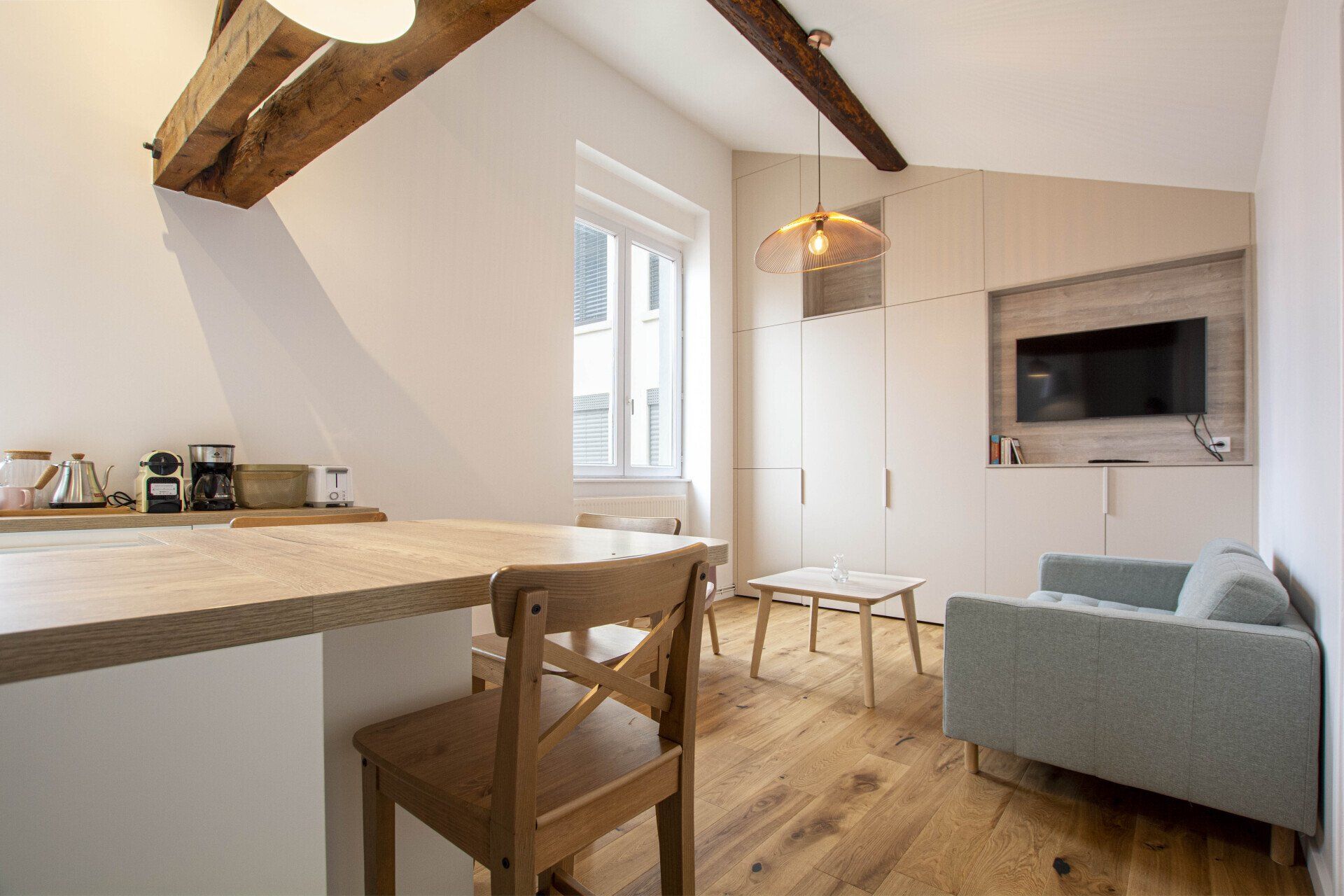 Dans les appartements compacts, il faut miser sur le multifonctions. En effet, dans ce salon/cuisine, on ne peut pas deviner le coin bureau qui se cache derrière ces grandes portes.... Et pourtant, grâce à leurs charnières à 360°, on peut bénéficier d'un véritable espace utile, et très pratique pour le cacher à toute vitesse quand les invités arrivent ! De part et d'autre de ce bureau sont disposés de nombreux rangements. L'appartement ne disposant d'aucune cave ou garage, c'est un confort indéniable. Une niche pour la TV a également été créé, avec l'ensemble des connectiques intégrés dans le meuble. Le moins on en voit, le mieux on se porte !