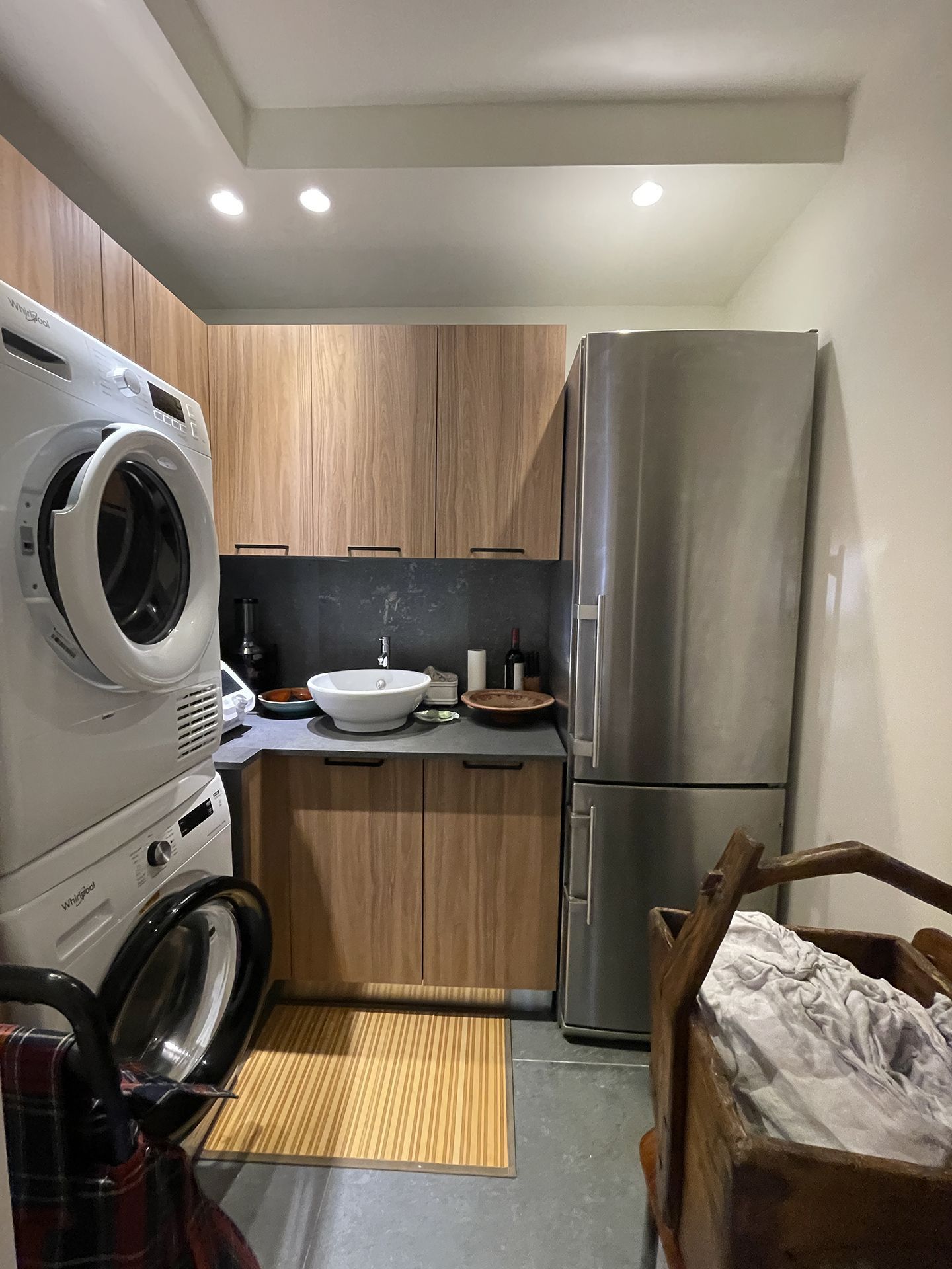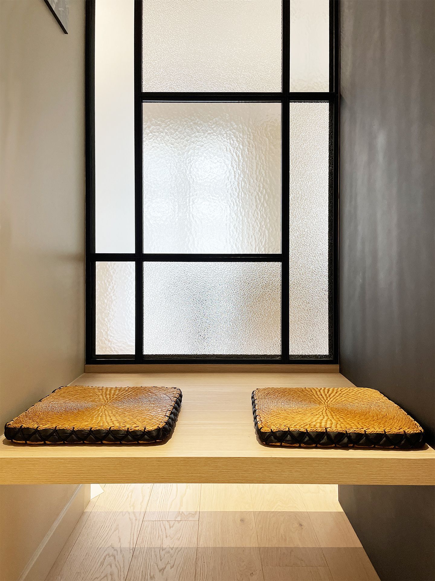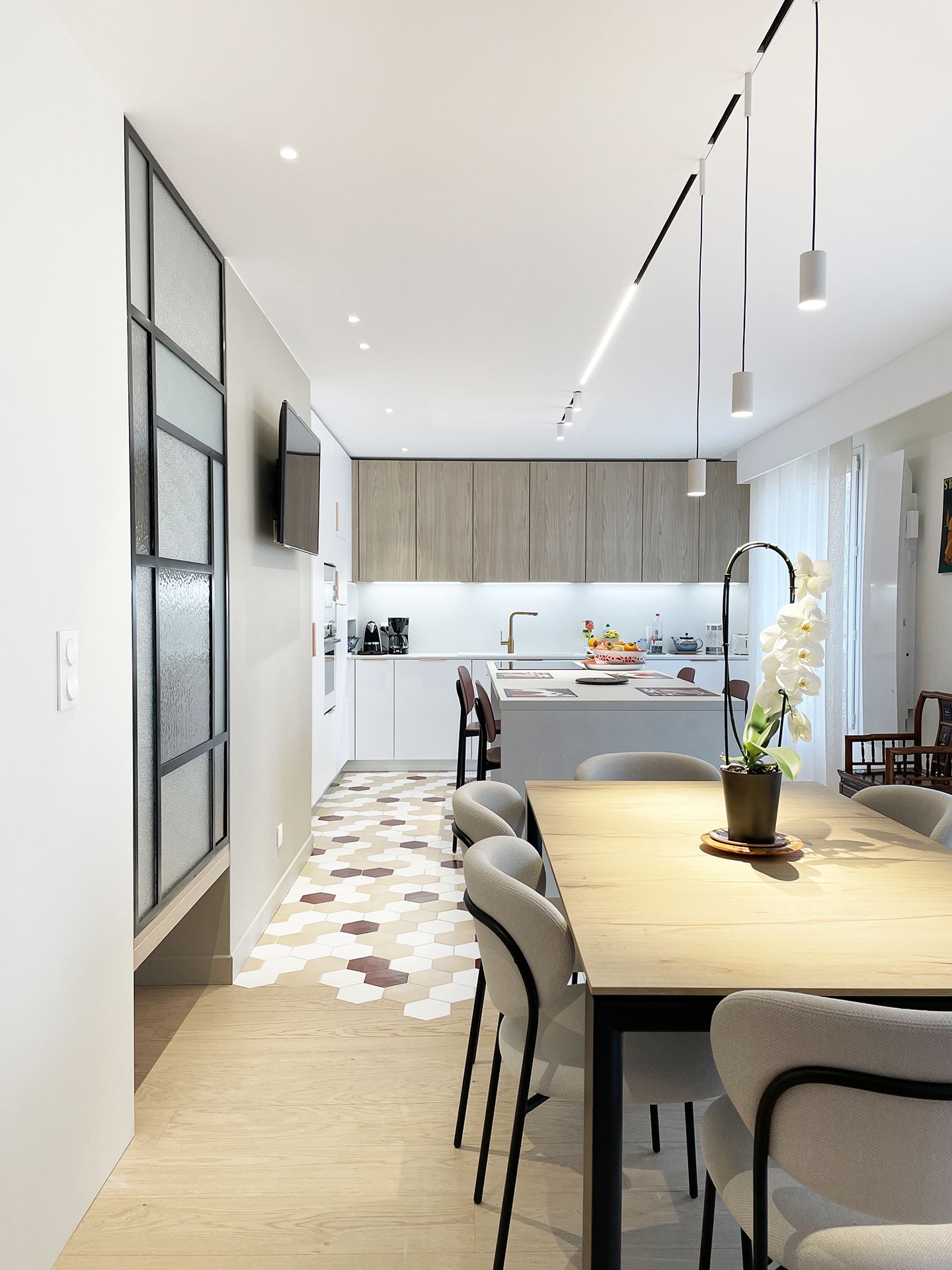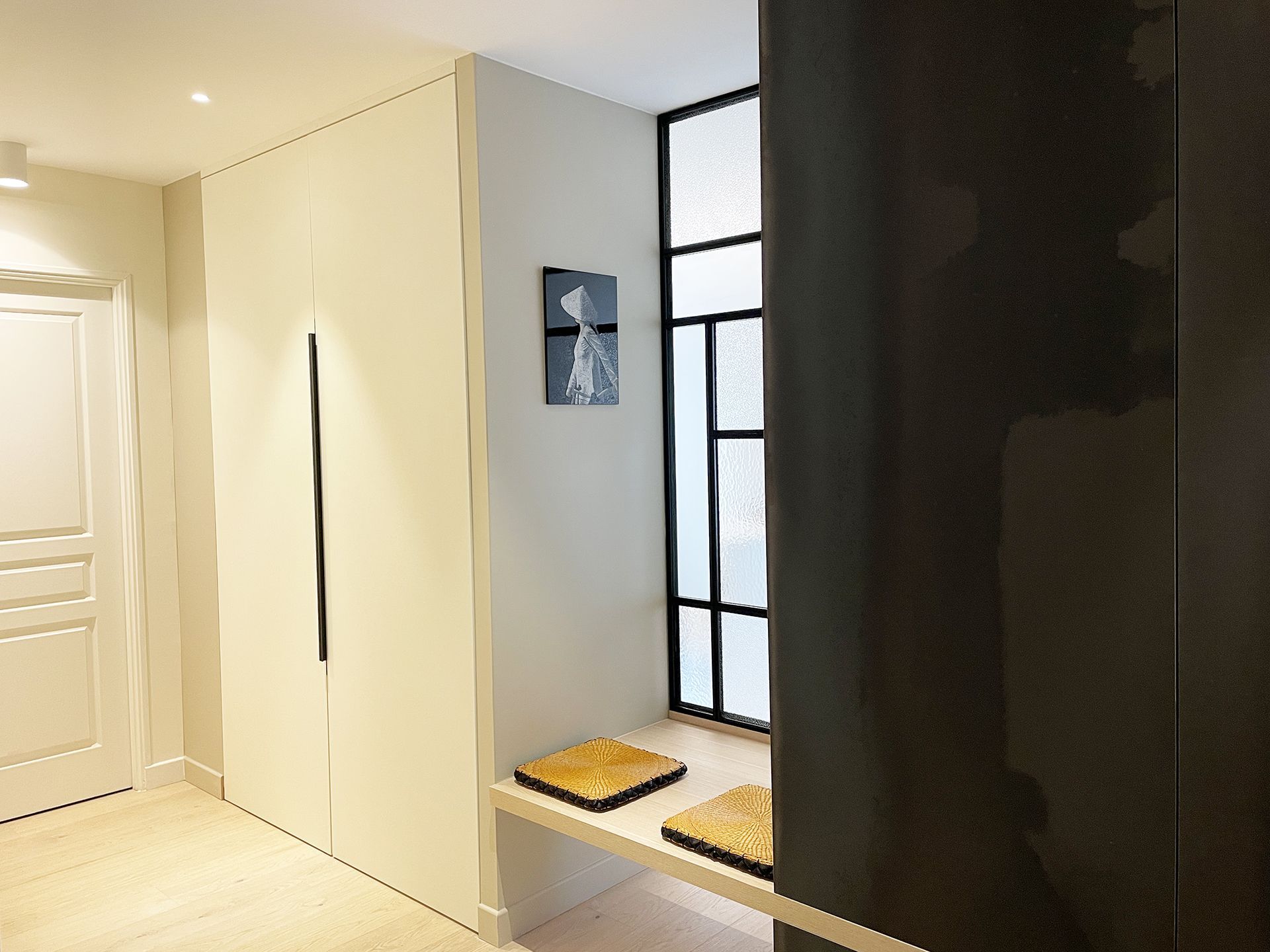 Ainsi, dès l'entrée, un grand placard sur mesure accessible des deux faces (côté entrée et côté cuisine), permet de créer un vrai sas d'entrée, cependant ouvert sur la pièce à vivre. Une élégante verrière permet de faire entrer la lumière des baies vitrées de l'autre côté et ainsi apporter de la lumière naturelle à cet espace. De ce sas, on accède désormais à la nouvelle buanderie / cellier (ancienne salle d'eau), et aux wc qui restent cachés depuis les pièces à vivre.