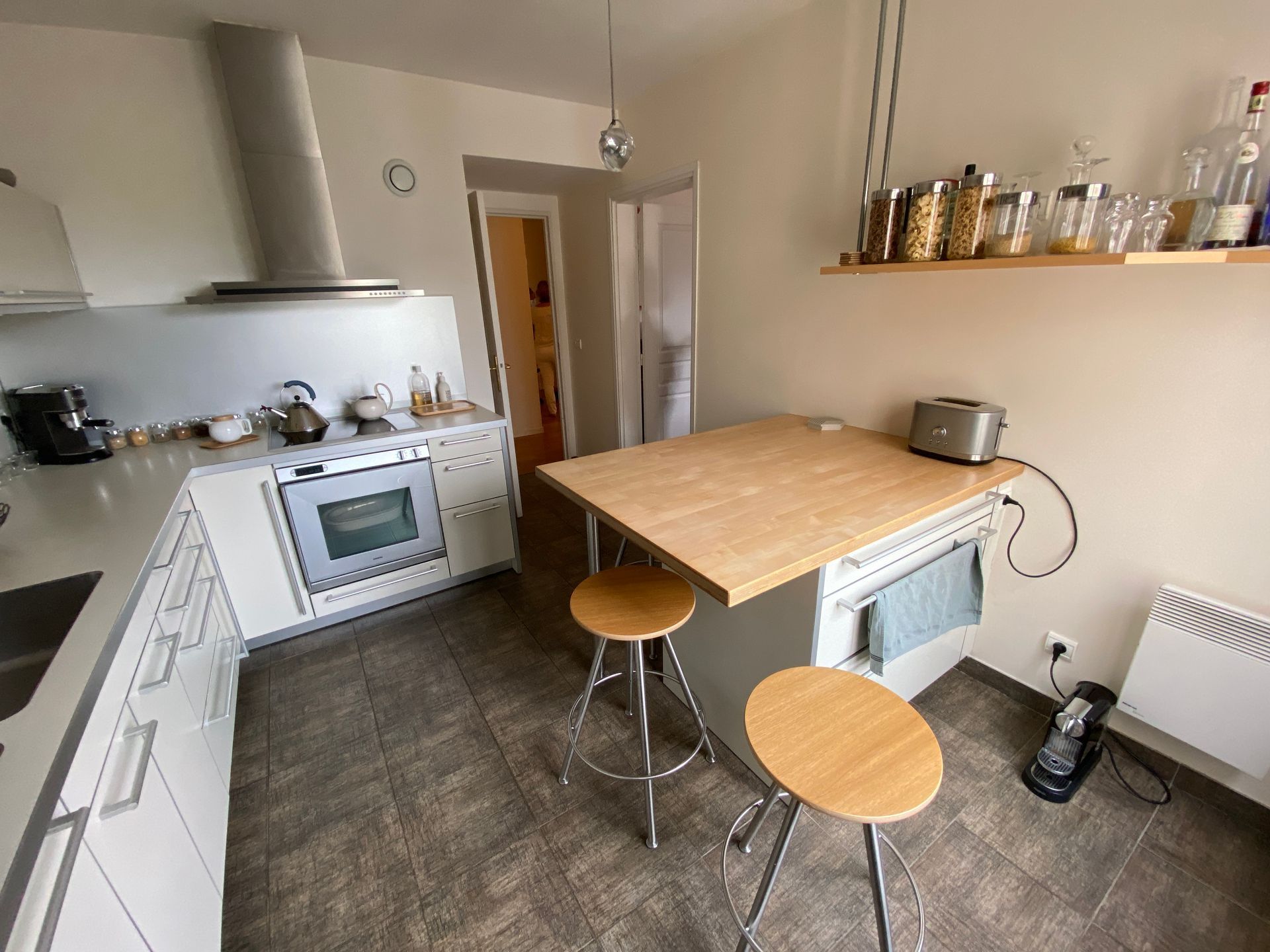 Tout en étant ouverte, la cuisine est cependant bien délimitée et peu visible des espaces à vivre grâce au grand meuble TV suspendu. A la fois pièce décorative maîtresse, cet élément permet, tout en étant très léger, de dissimuler la télévision, tous les câbles nécessaires, des rangements,... et sépare sans cloisonner la salle à manger et la cuisine. Des espaces ainsi tout en continuité, sans porte, mais ayant chacun une intimité propre.